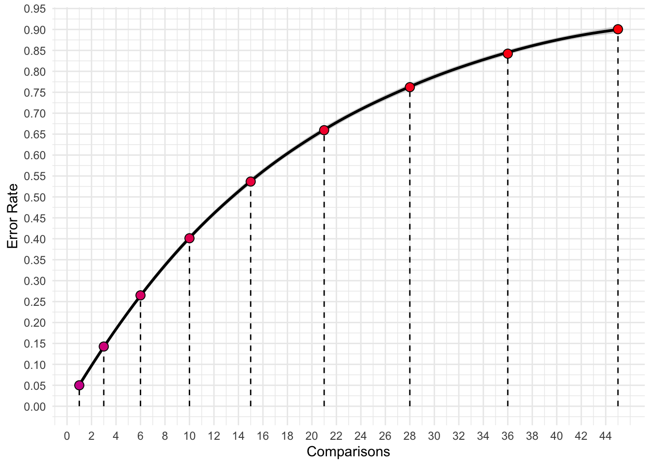 However, this would result in an inflated Type I error rate. Recall that we typically set our \(\alpha = .05\). Thus, the rate to not get a Type I error is \(.95\). With six independent comparisons our alpha rate actually becomes: