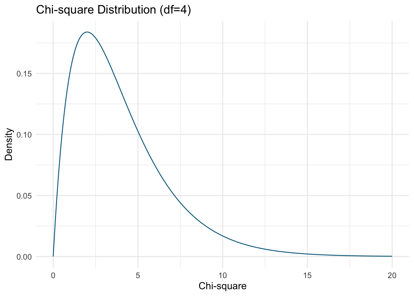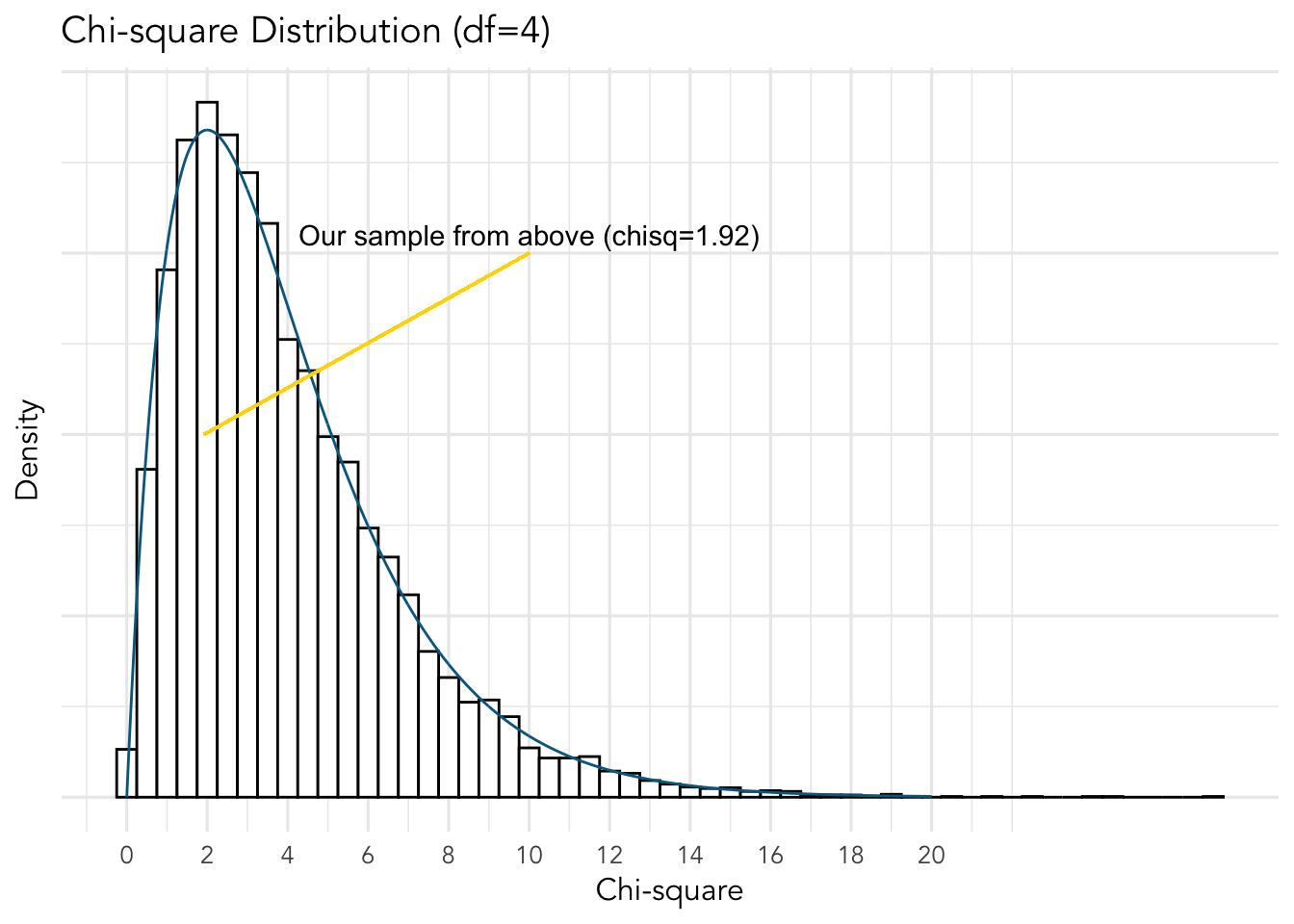 So…why does all this matter? A chi-square value is the sum of squares of standard deviates. The chi-square distribution is the distribution of the sum of squares of a given number of deviates, our df, under repeated (infinite) samples. So, if we randomly sampled four people an infinite number of times, the sum of squared deviates would form a chi-square distribution with four df. Here’s what that would look like”