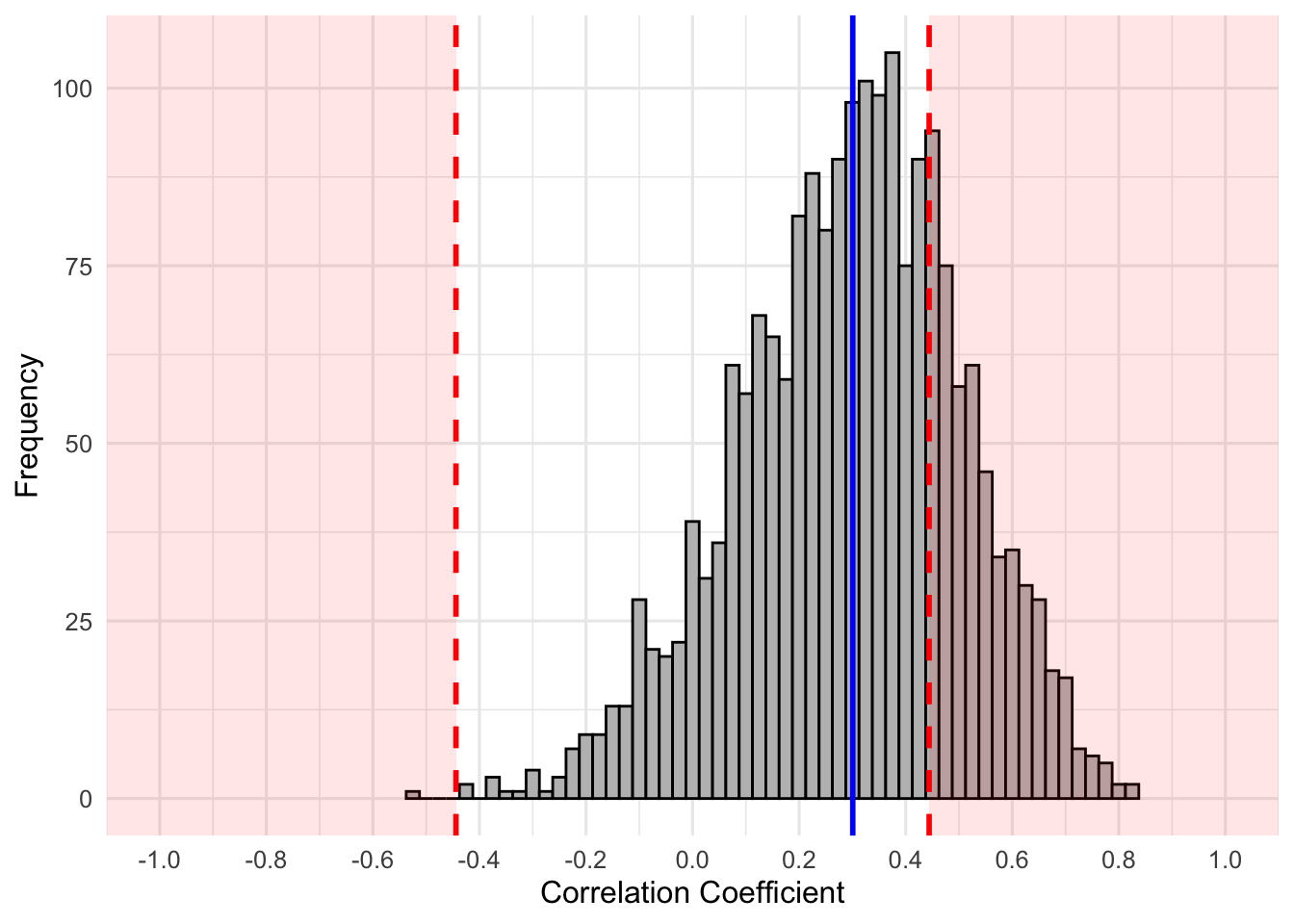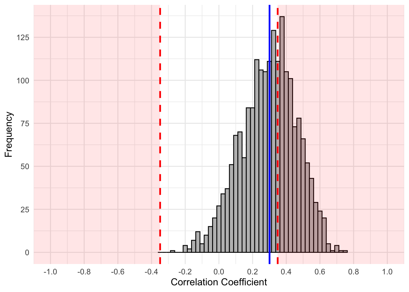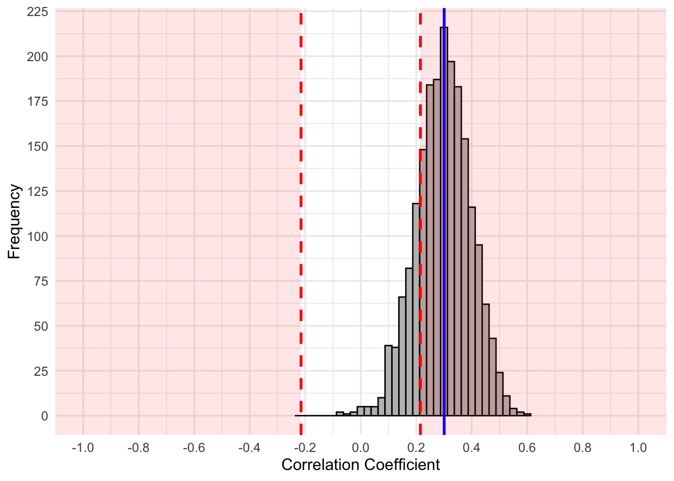 This graph represents the distribution of correlation coefficients for each of our random samples, which were drawn from the 100,000 high schoolers. Notice how they form a seemingly normal distribution around our true population correlation coefficient, \(\rho=.300\). Although it may seem normal, it is actually skewed because of the bounds of the correlation (i.e., -1 to 1). The red lines and shaded regions represent correlation coefficients that are beyond the r = .215 cut-off, which would result in \(p < .05\). Thus, these are statistically significant results in our test of the null hypothesis (i.e., \(\rho = 0\)). The blue line represents the true population correlation coefficient (\(\rho=.300\)). Just how many samples scored at or beyond the critical correlation value of \(r = .215\)?