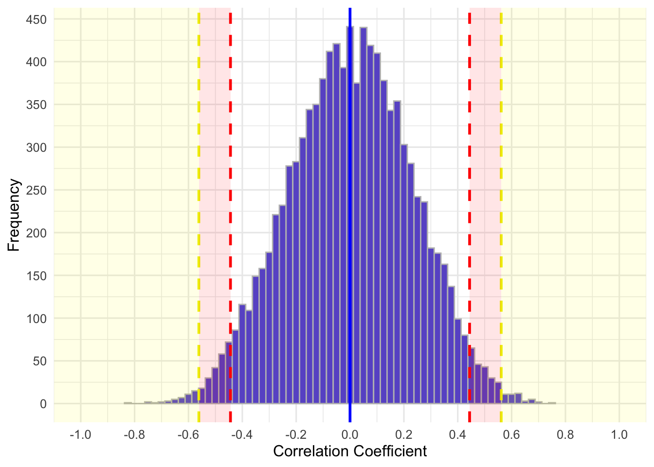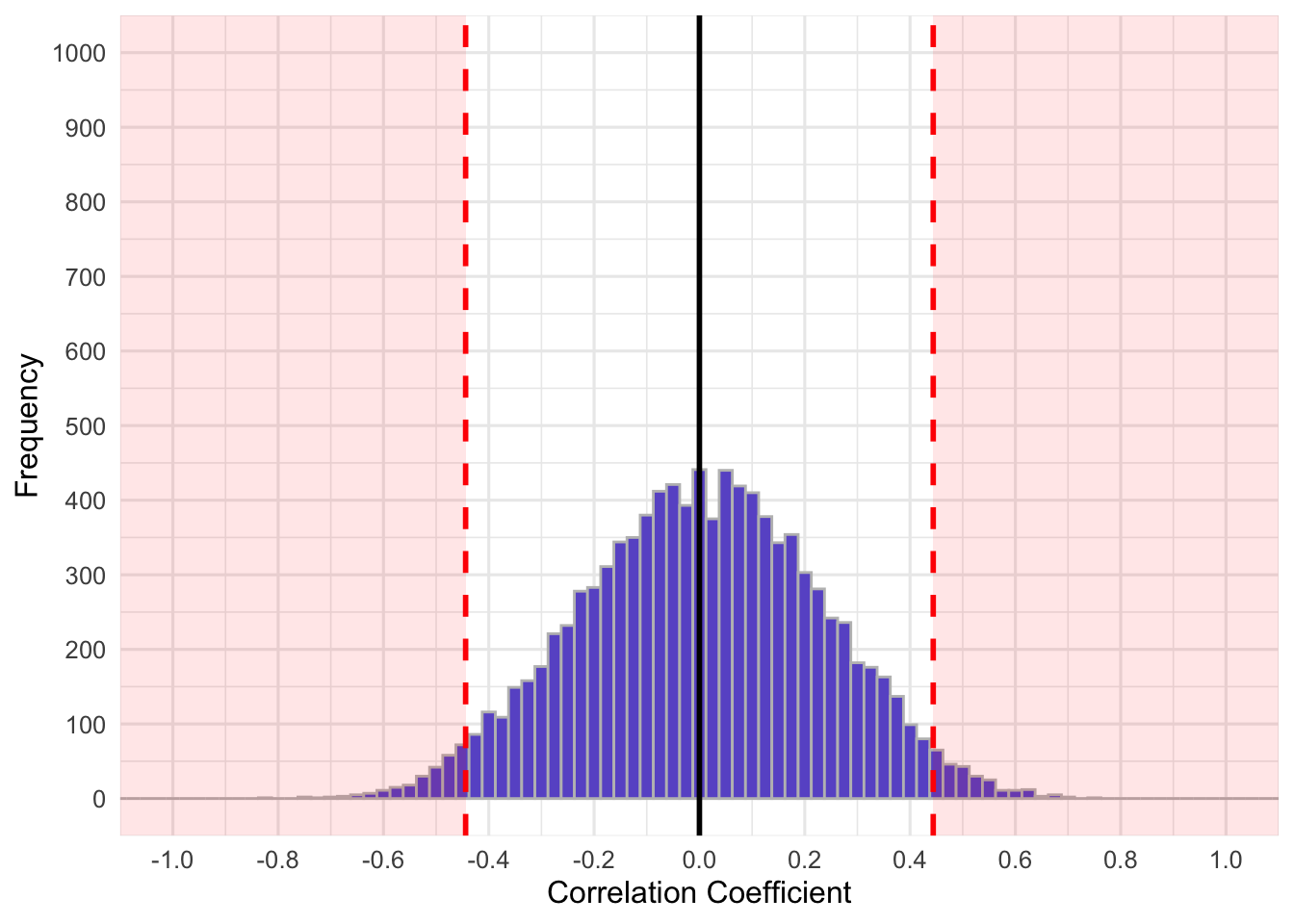 The above shows the distribution of 10,000 correlation coefficients derived from simulated samples from a population that has \(\rho=0\). Although not quite an infinity number of samples, I hope you get the idea. The red shaded region shows the two tails that encompass 5% of the samples (2.5% per tail). These extreme 5% are at the correlation coefficients, \(r \ge .444\) or \(r \le -.444\). Thus, there is a low probability of getting a correlation beyond \(+/-.444\) when the null hypothesis is true. If we ran a correlation test with sample \(n=20\) and \(\alpha = .05\), a correlation of \(r=.444\) would result in approximately \(p=.05\) (the actual value of \(p\) for \(n=20\) and \(r = .44377\) is \(p = .049996\), but there are rounding errors). Because the probability of this data is quite low, given \(H_{0}=0\), we often reject the null hypothesis. Our data is very unlikely given a true null hypothesis, therefore we reject the null.