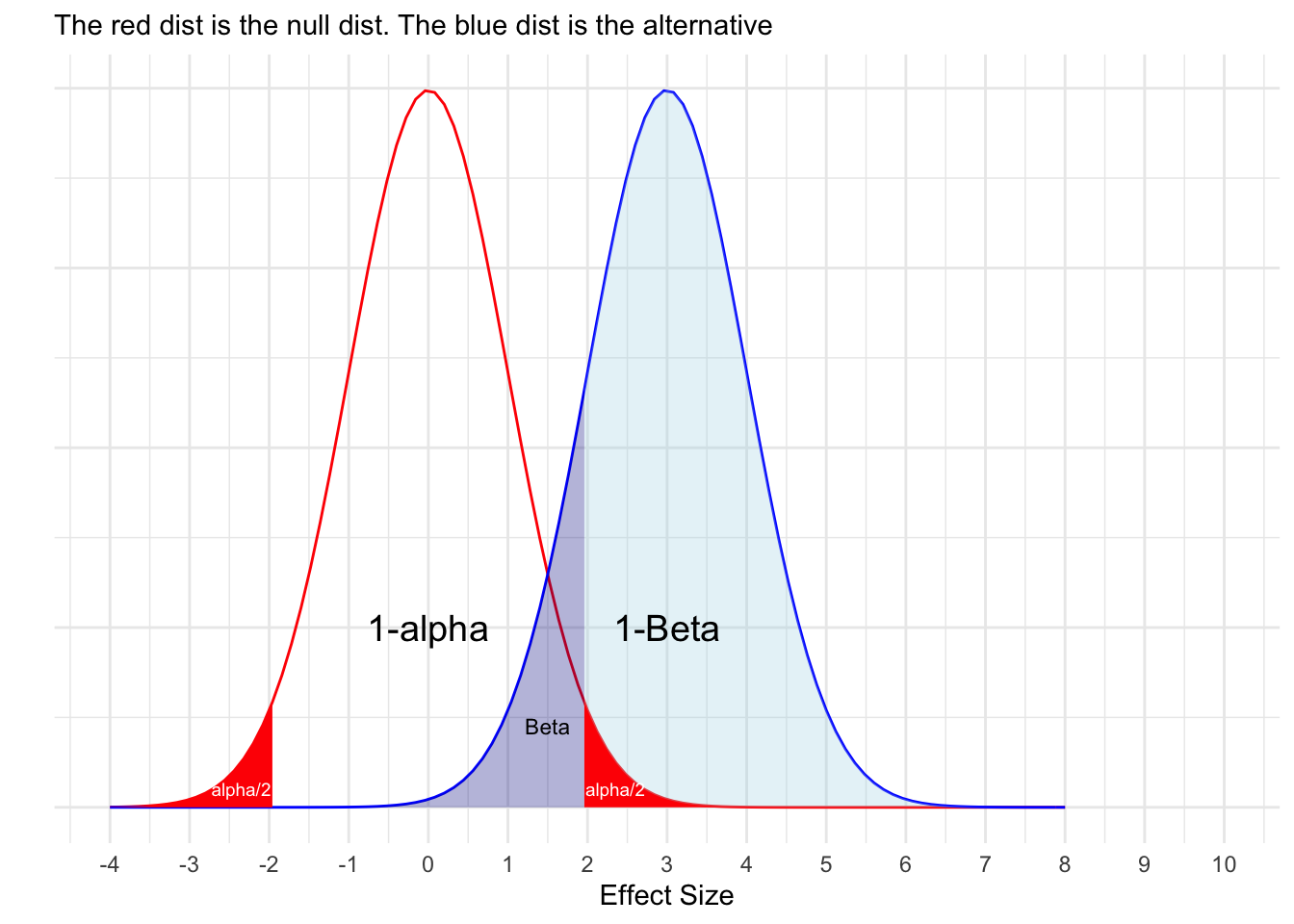See the following figure for a depiction, where alpha=\(\alpha\) and 1-beta = \(1-\beta\) = power: