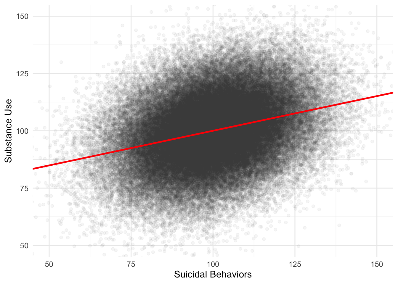 Consider a researcher who is interested in the association substance use (SU) and suicidal behaviors (SB) in Canadian high school students. Let’s assume that the true association between SU and SB is \(\rho = .3\); we do not know that this is the true value. The population data might look like this: