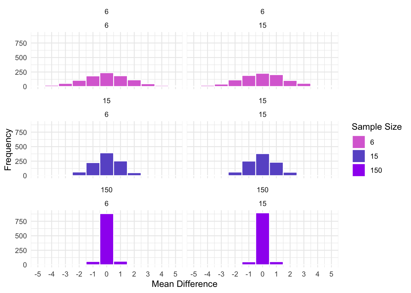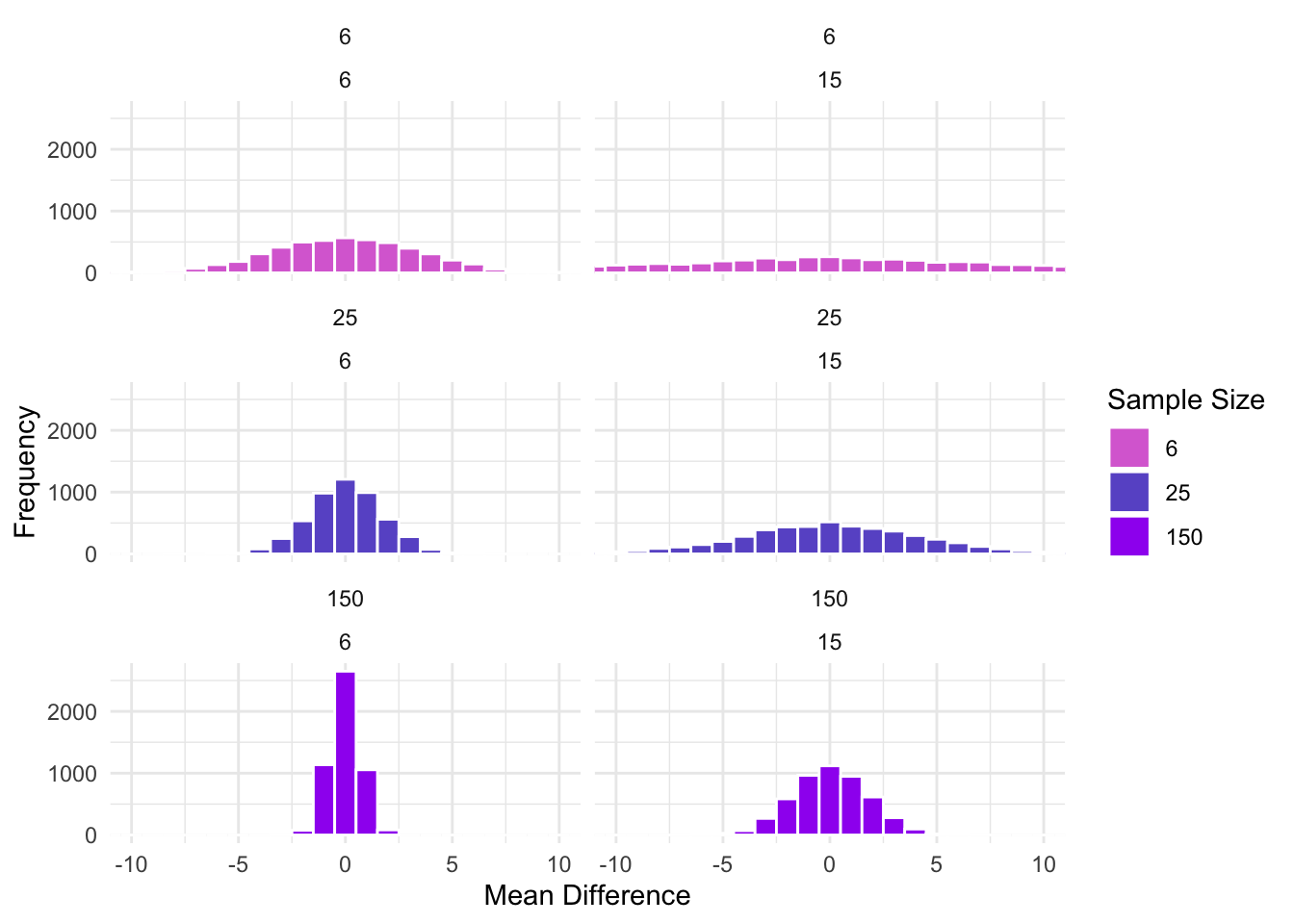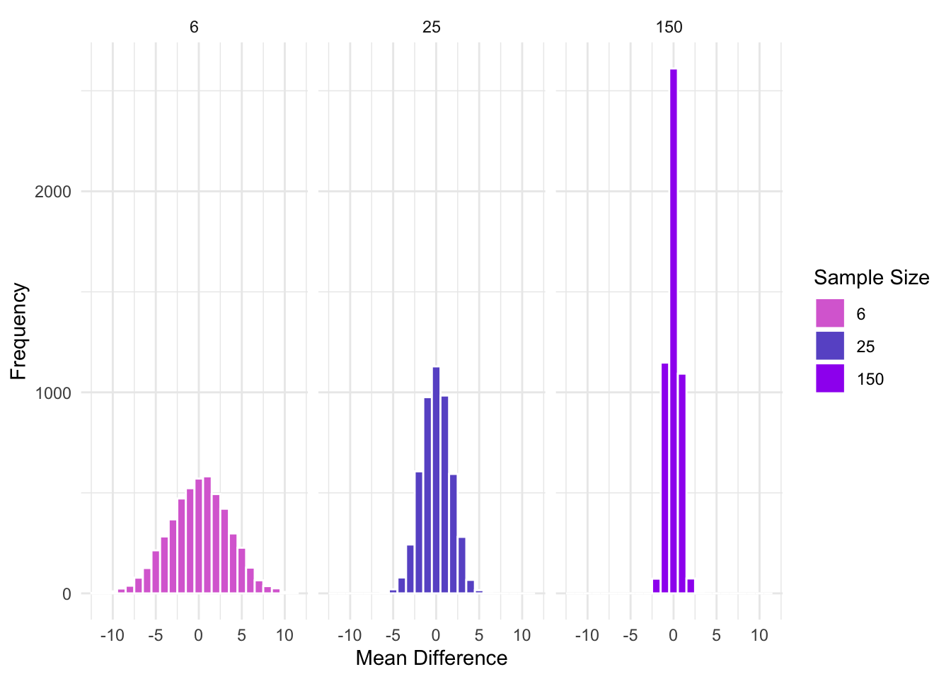 So, when we subtract two means from two sample drawn from the same population, they vary quite a bit. Sometimes one mean is higher, sometimes the other is, and most times they are about the same. However, this will also vary depending on the sample size used for each of the means. For example, let’s compare various sample sizes: