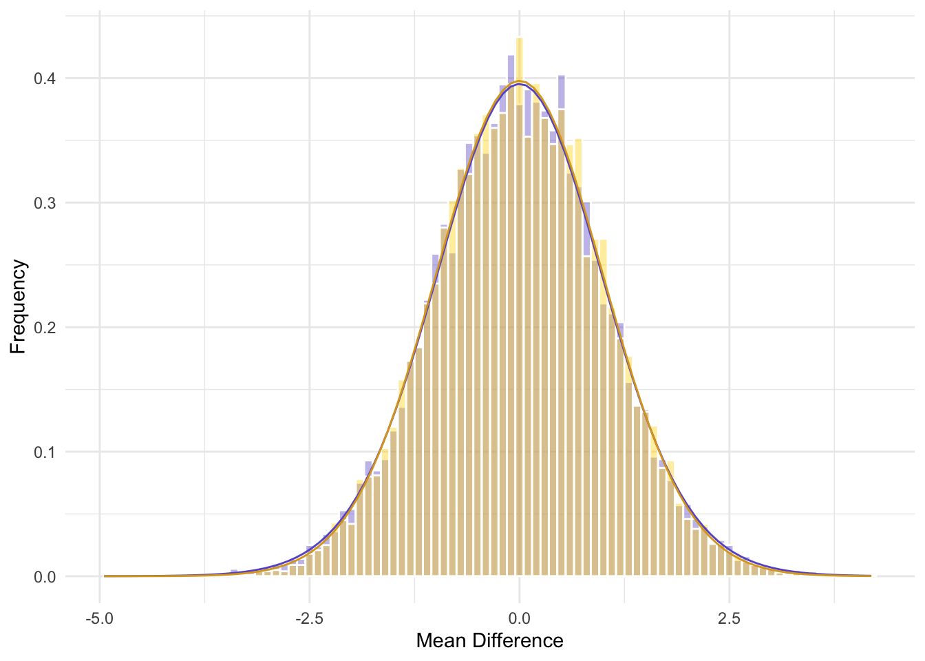 What happens when we divide the mean differences by the standard error of the mean differences? For the t-distribution, the standard error of the mean differences is, for equal sample sizes, \(\sigma_\bar{x} = \frac{\sigma}{\sqrt{n}}\).