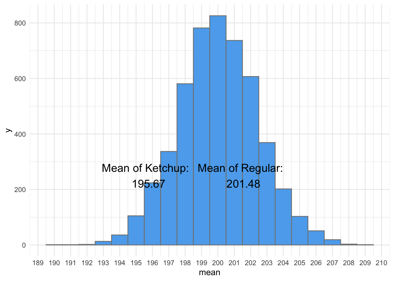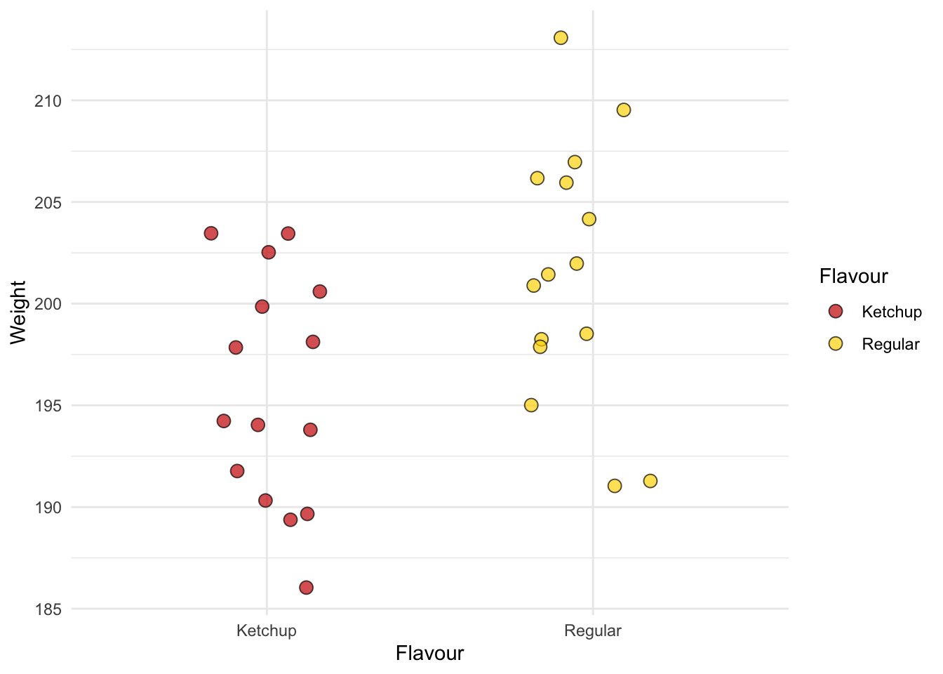 Let’s use another example similar to the last one. We have a new theory: that Lays purposely puts less chips in a bag of Ketchup Chips than Regular Chips because the seasoning in ketchup chips costs more to produce. From this, we hypothesis that Ketchup Chips (200g) weigh less than Regular Chips (200g). Note that the 200g represents how much the bags supposedly weigh. We annoyingly emailed the company and got the similar response: “All our bags of chips weigh on average 200g, regardless of flavour! Stop email me!”