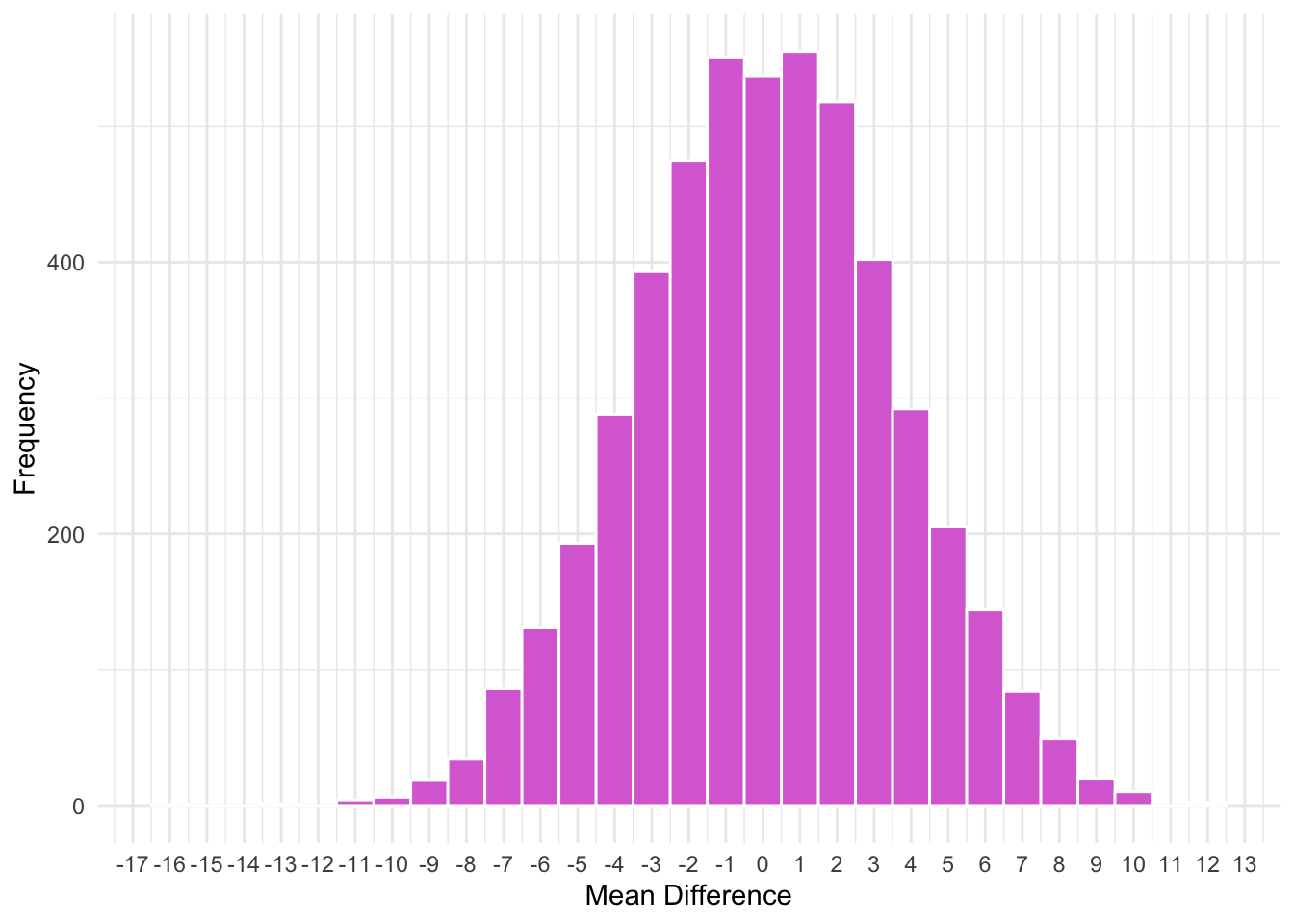 To test our hypothesis, we can build on this distribution. Imagine we subtracted the means of two sample drawn from the distribution above, over, and over, and over. We can model this distribution as well: