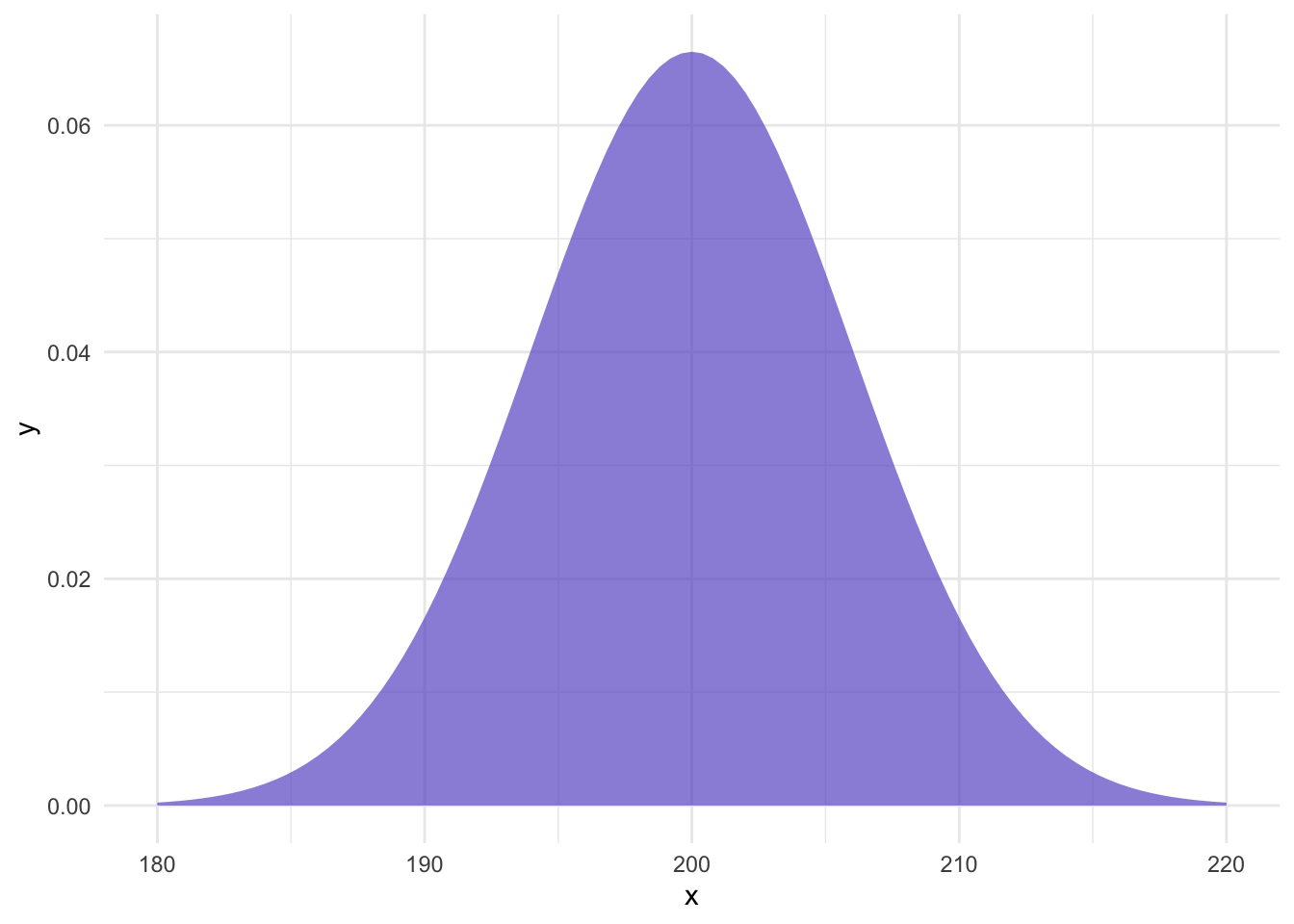 Given that Lays has communicated the population parameters, we can calculate how likely our sample is. First, let’s visualize the distribution of chips with a \(\mu=200\) and \(\sigma=6\):
