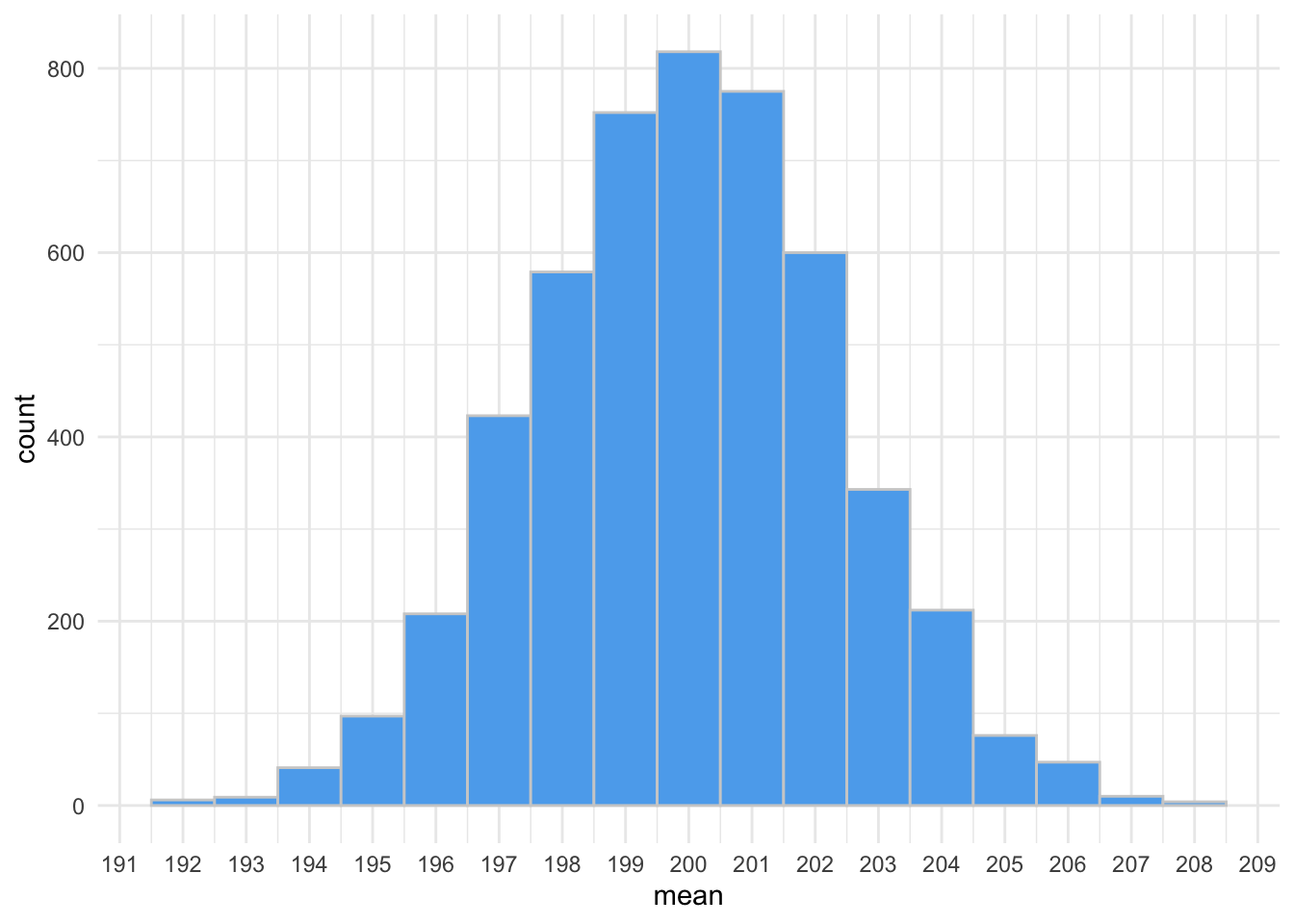 Imagine that the six bags of chips that we sampled somehow came from this distribution. Although most are around 200g, some are much higher or lower. Now, to take it one step further, let’s plot the distribution of sample means. That is, imagine we took a sample of six bags from the above distribution of chips over, and over, and over, and over…