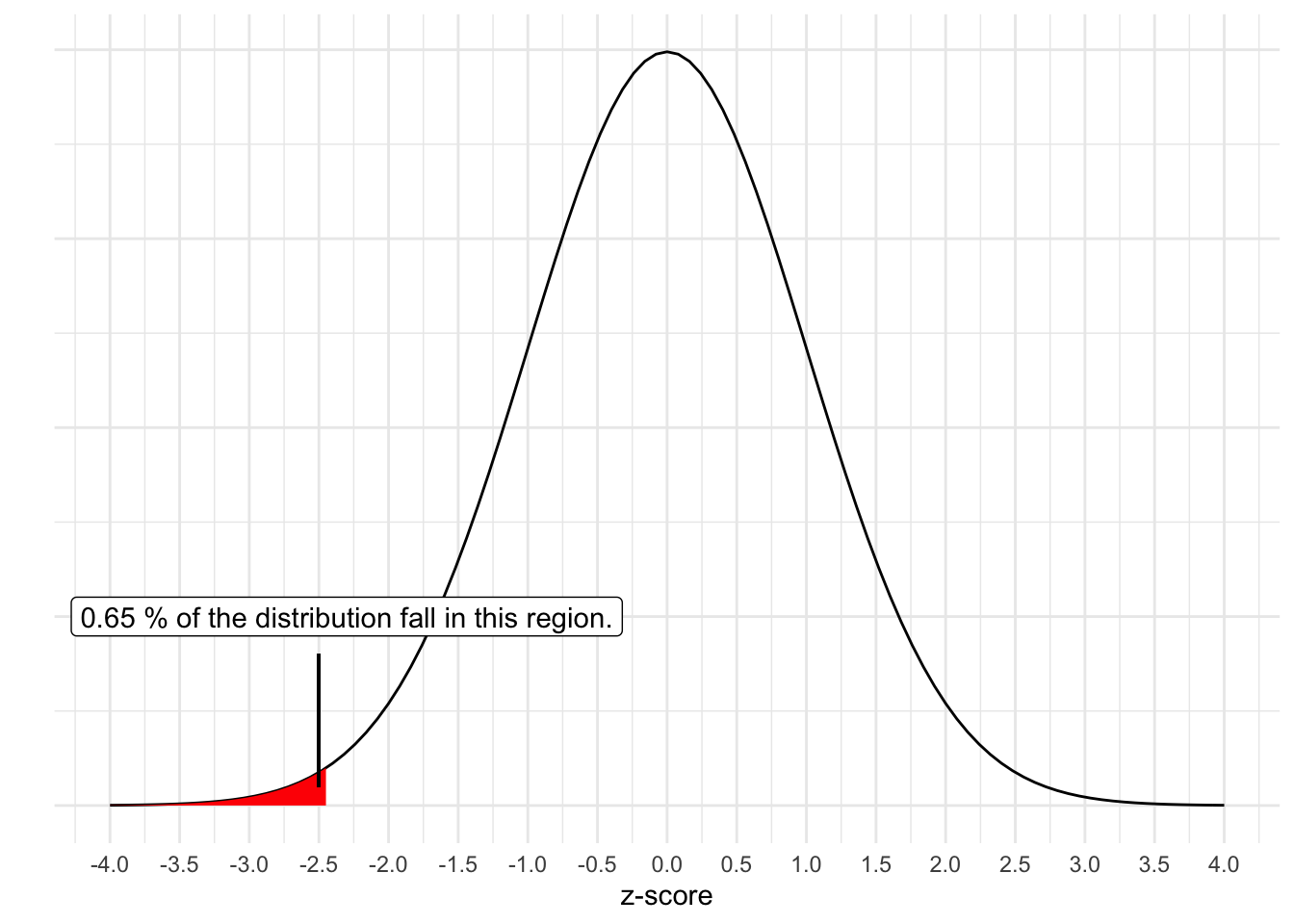 and the probability of getting a z-score that low is 0.0065. Recall that the normal distribution has some unique properties and we can find out the proportion of scores that fall in the tails. While you may have used table like the previous link in past courses, computers can easily determine the exact quantity (e.g., pnorm() in R). Such that: