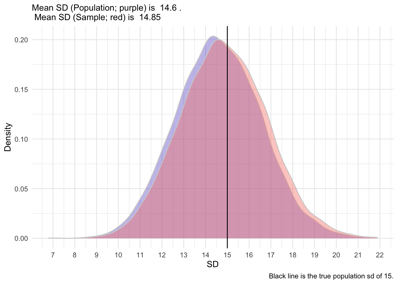 So, as you can see, the sample formula provides a less biased estimate of the true population SD. It’s shifted slightly to the right, closer to the true population SD. We hope that the mean and standard deviation that we collect in a sample (termed statistics) are somewhat good indicators of those in the population (termed parameters).