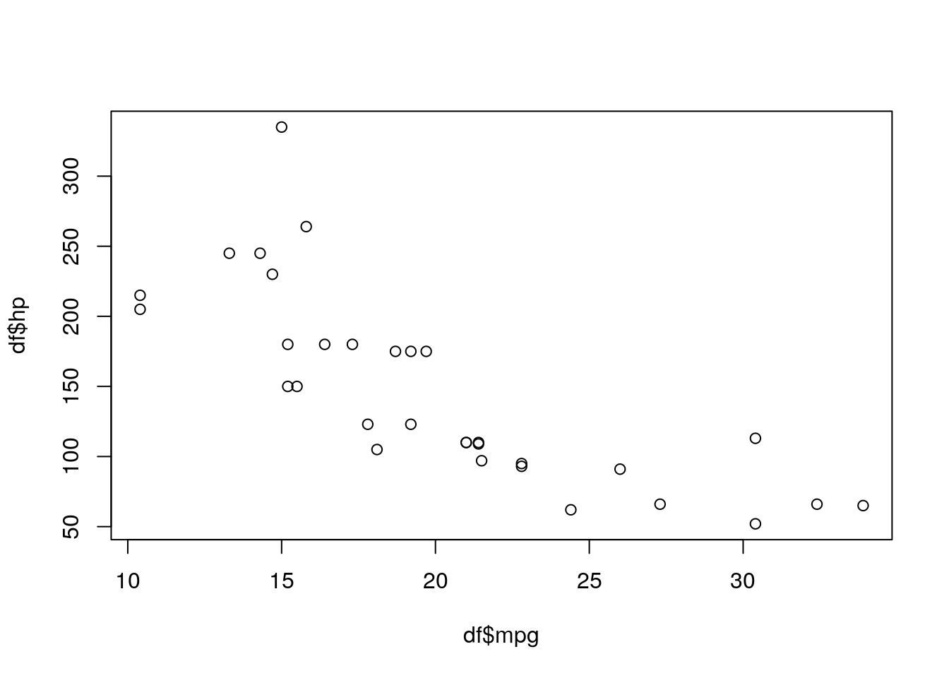 You can quickly plot with the plot() function. It will take the variables you put in the function and try to make the best type of figure. Let’s plot two variables from our data set: mpg (miles per gallon) and hp (horsepower).