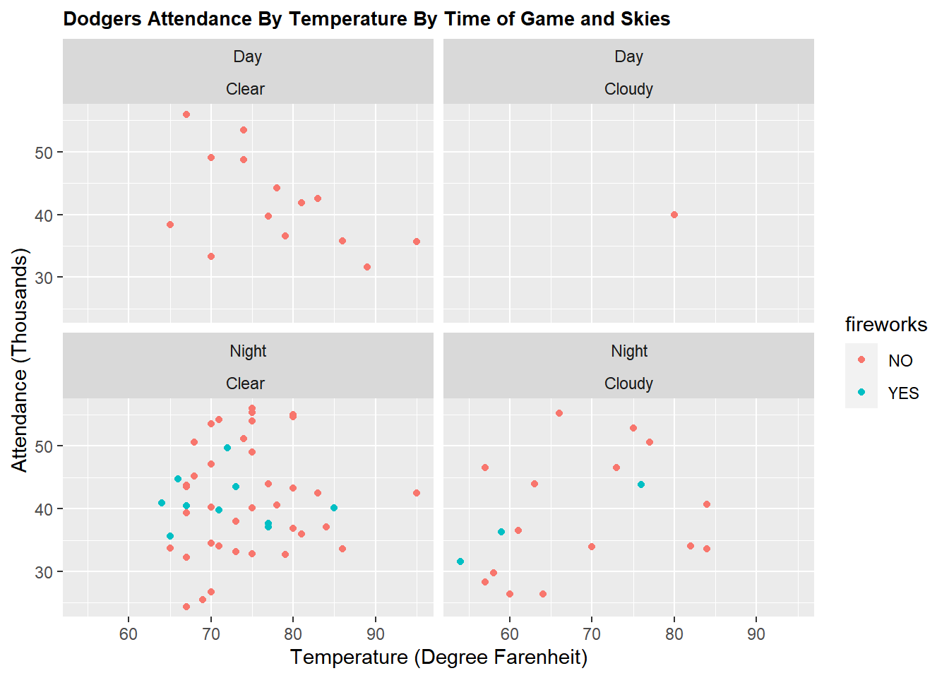 ggtitle("Dodgers Attendance By Temperature By Time of Game and Skies") +