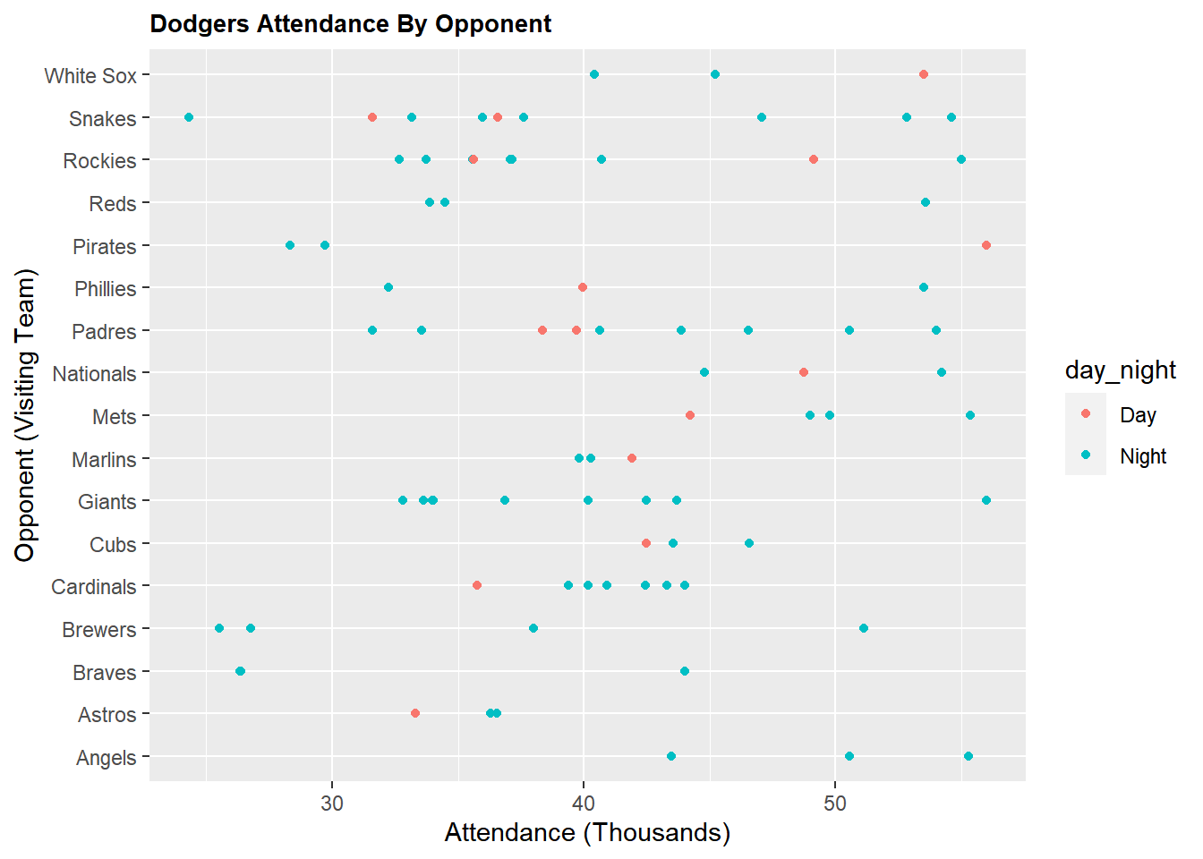 ggplot(DodgersData, aes(x=attend/1000, y=opponent, color=day_night)) +