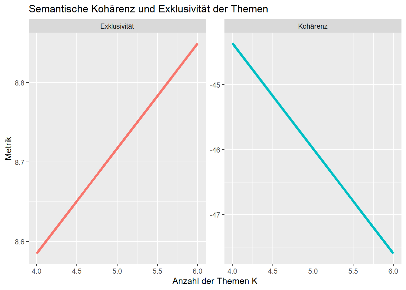 Sobald wir uns für ein Modell mit K Themen entschieden haben, können wir die Analyse durchführen und die Ergebnisse interpretieren. Der Einfachheit halber nehmen wir jetzt beispielhaft das Modell mit K = 6 Themen, obwohl weder der statistische Fit noch die inhaltliche Interpretierbarkeit uns hier eindeutige Hinweise darauf liefert, ob eines der beiden Modelle mit 4 oder 6 Themen gute oder bessere Ergebnisse liefert.