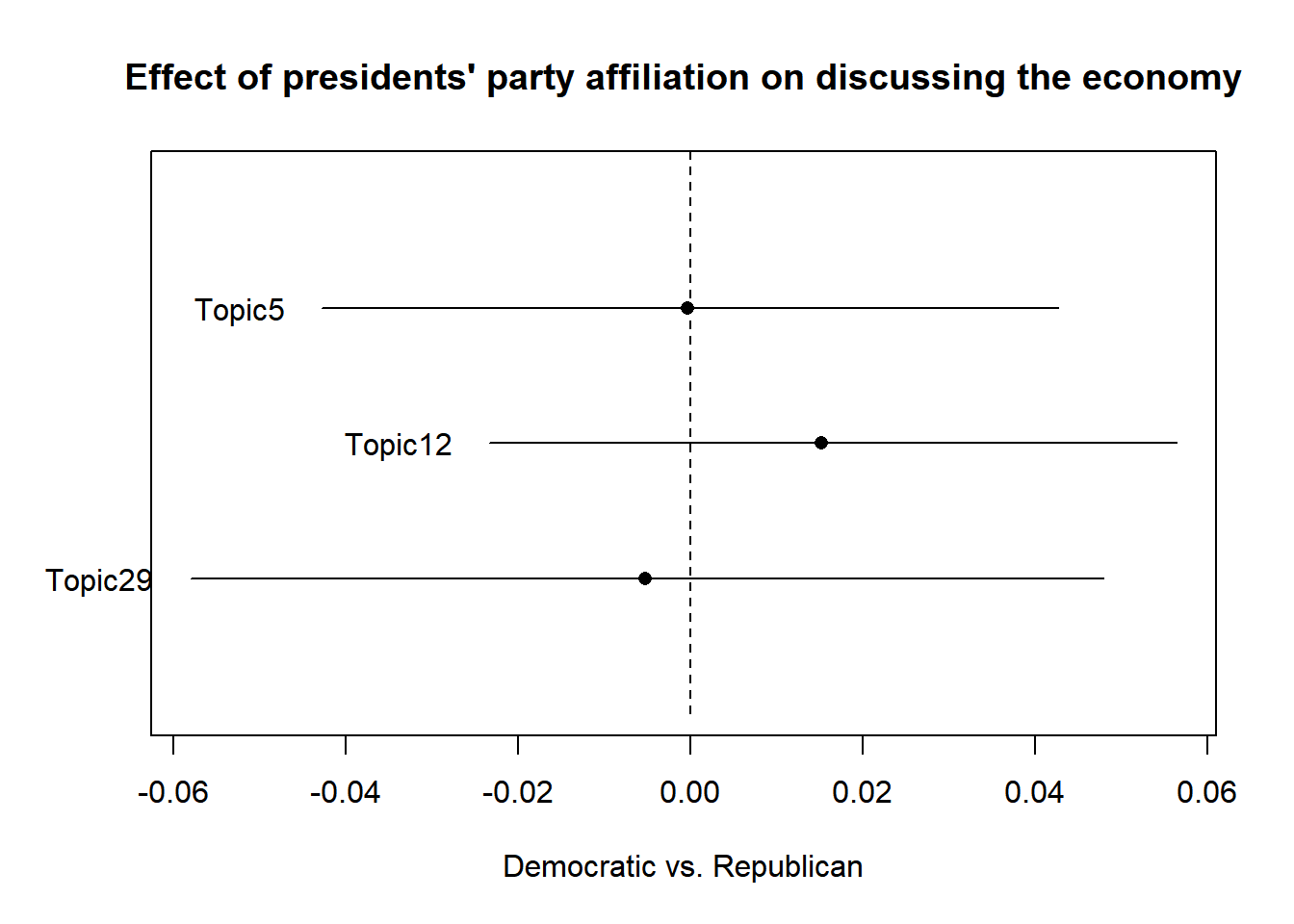 Writing the corresponding R code, please plot the effects of party affiliation on the prevalence of the economy-focused topics 5, 12, and 29.