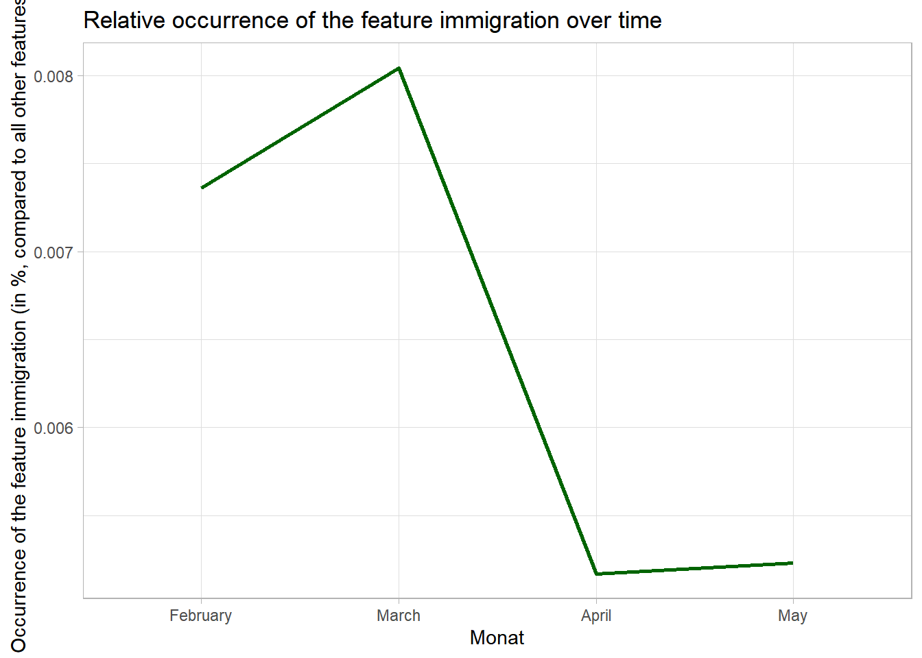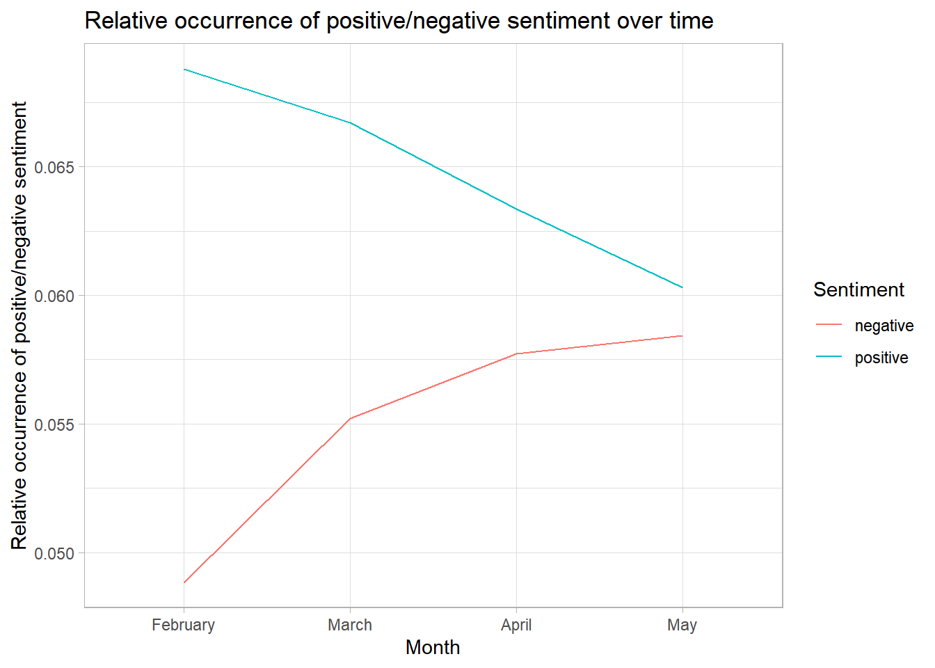 As we already know, it often makes little sense to consider the absolute occurrence of features over time (since the number of articles published each month or their length may change). We therefore only consider the relative percentage of feature occurrences assumed to depict negative or positive sentiment over time.