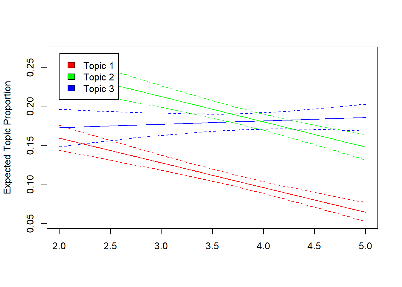 As mentioned before, Structural Topic Modeling allows us to calculate the influence of independent variables on the prevalence of topics (and even the content of topics, although we won’t learn that here).