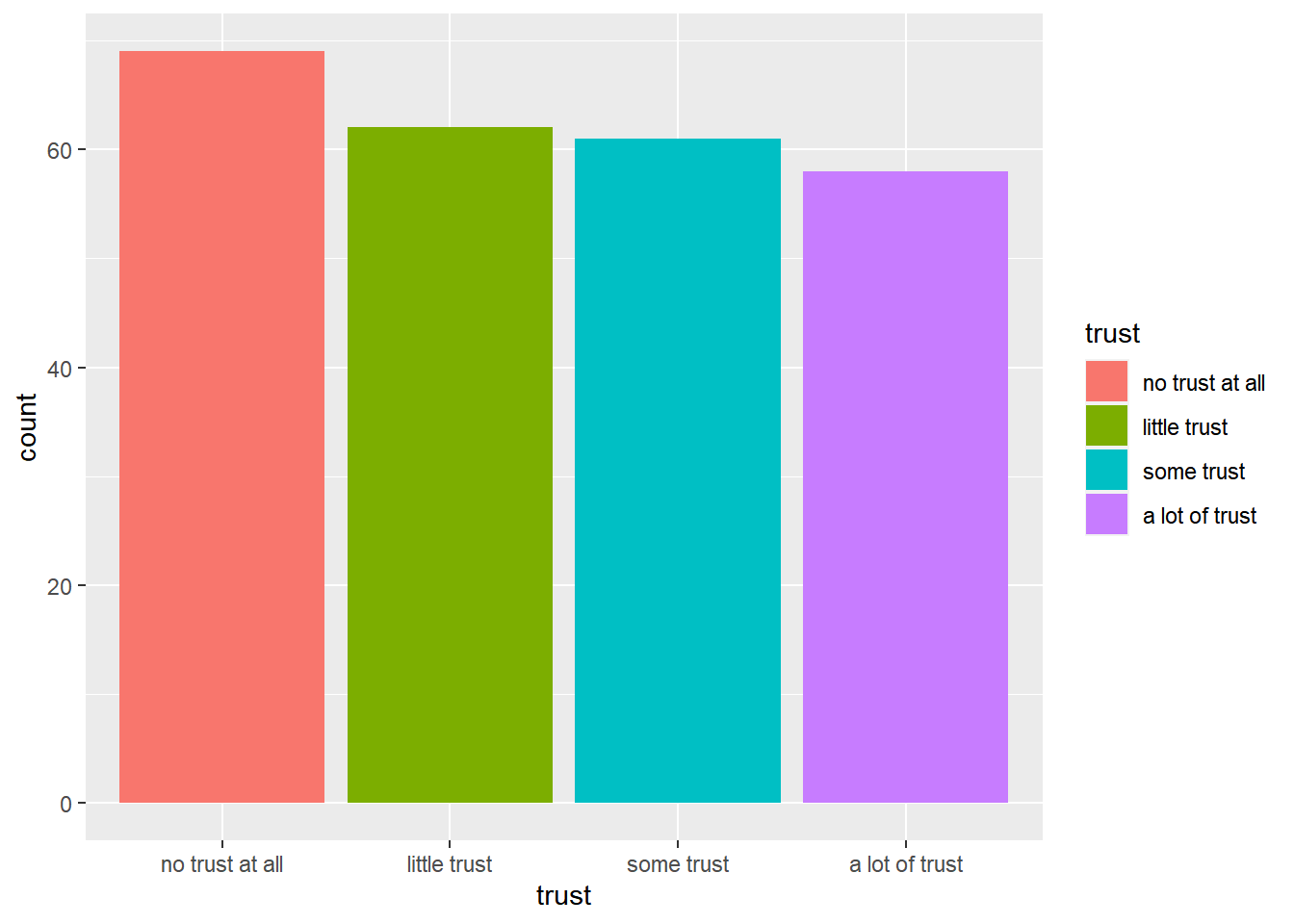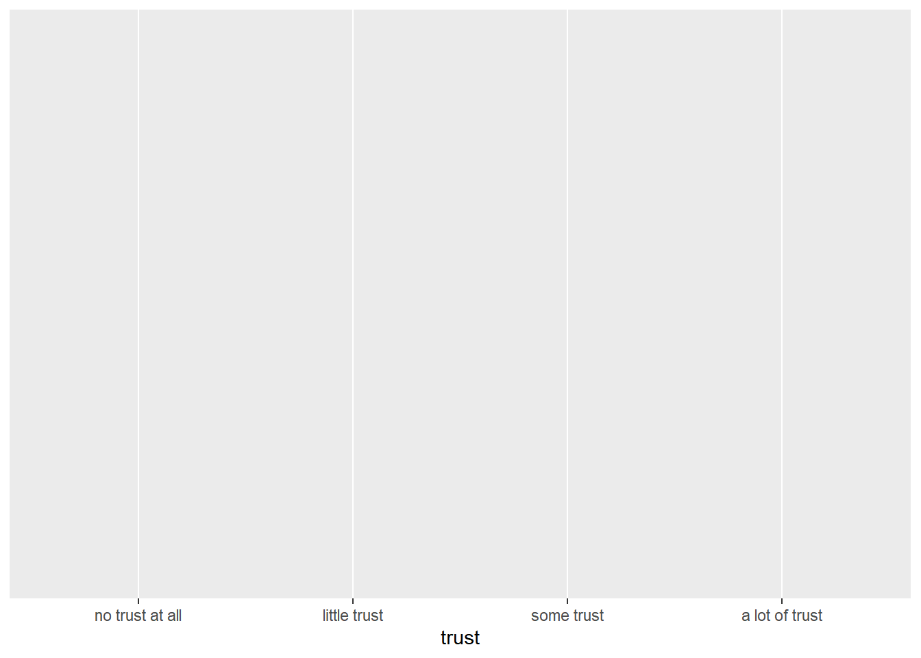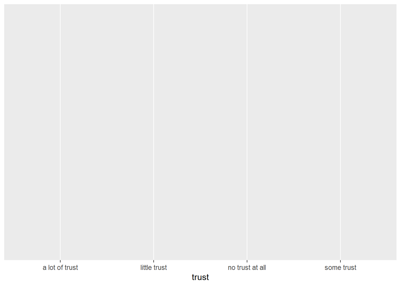 We want the x axis to depict the count of respondents answering with “no trust at all”, “little trust”, “some trust”, and “a lot of trust”. Thus we set x = trust via aes().
