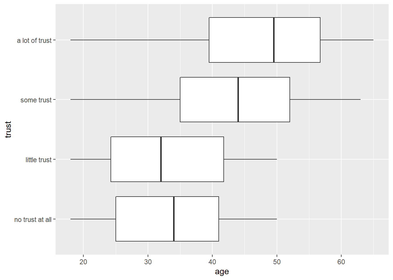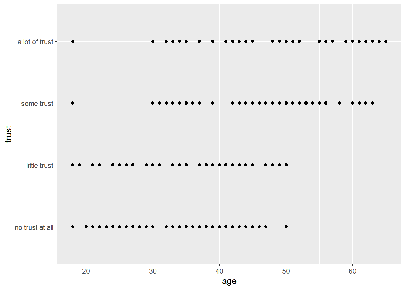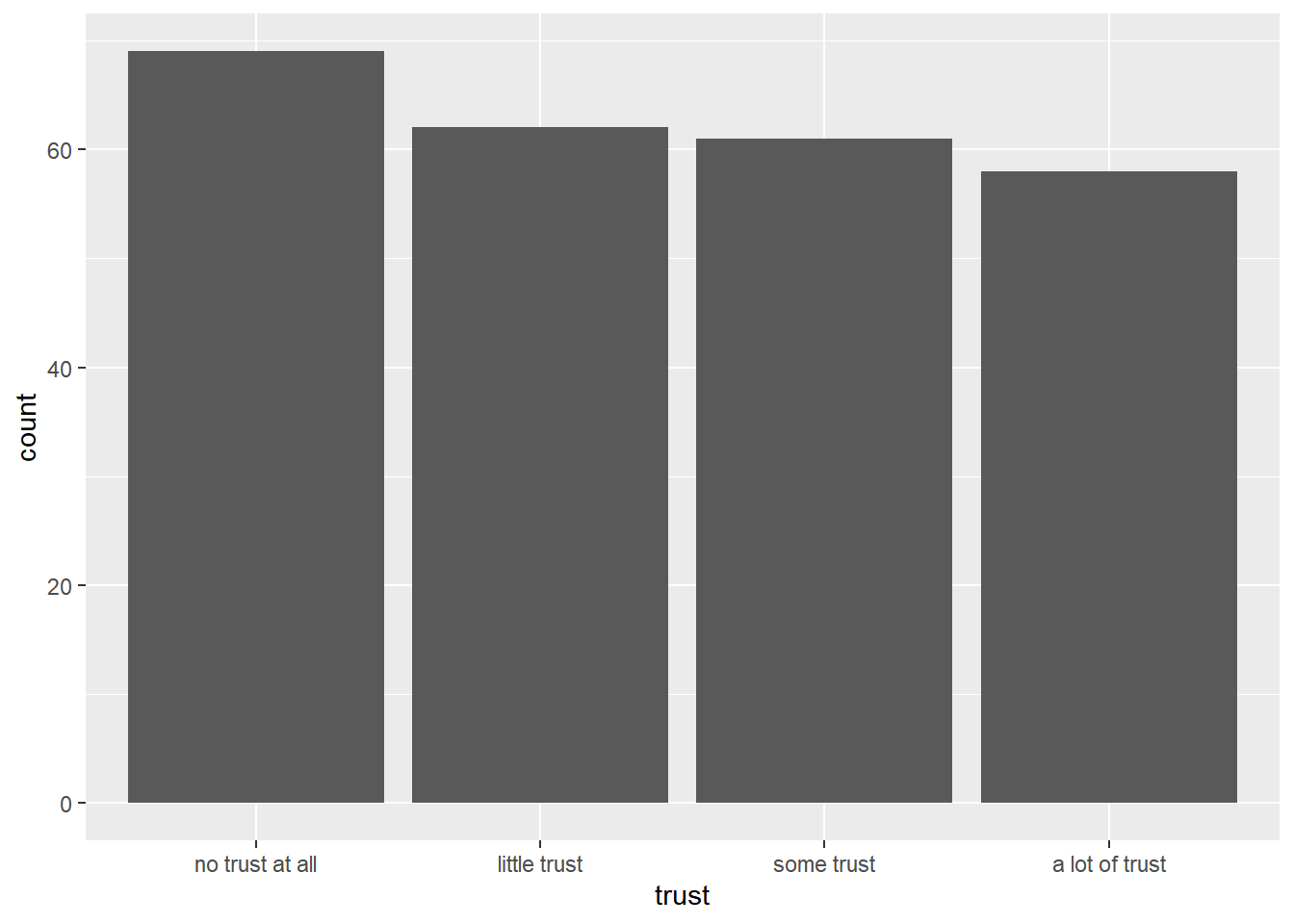 We want the x axis to depict the count of respondents answering with “no trust at all”, “little trust”, “some trust”, and “a lot of trust”. Thus we set x = trust via aes().