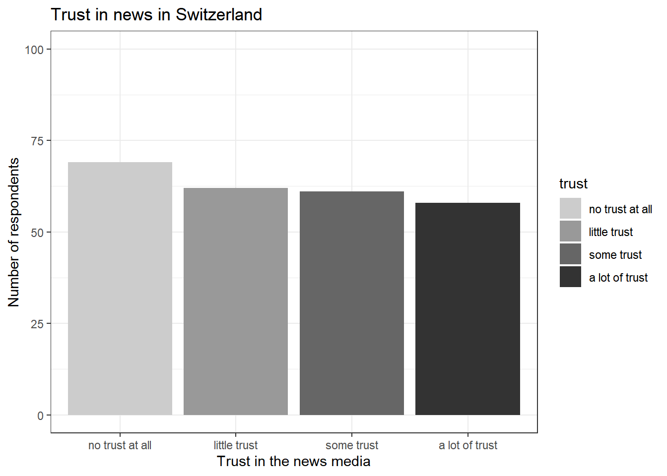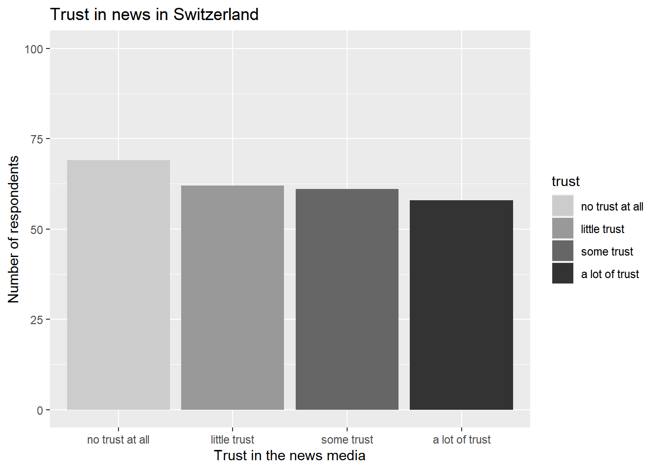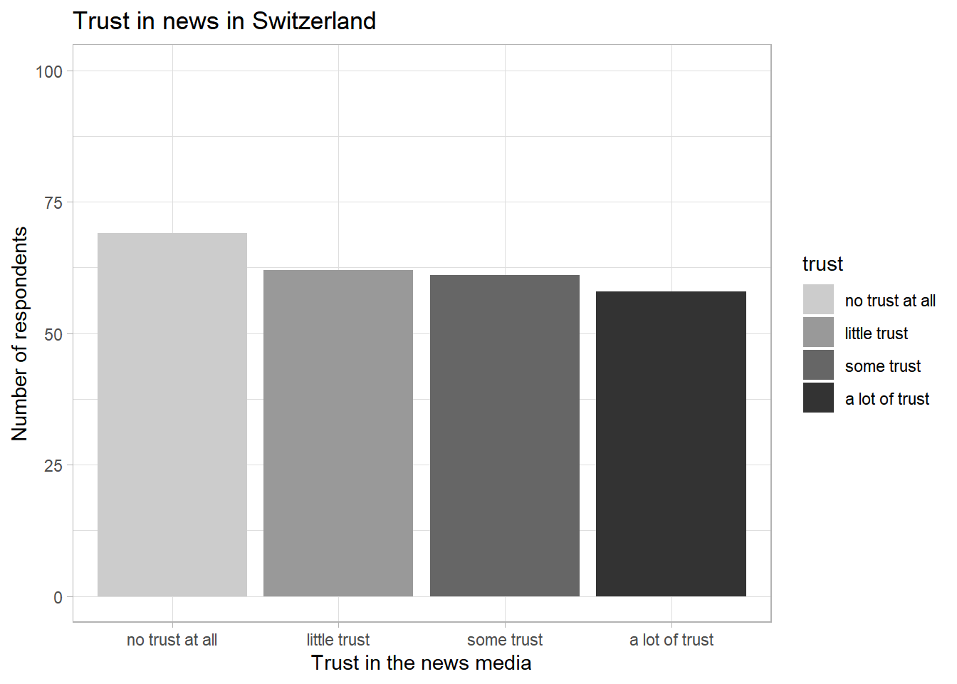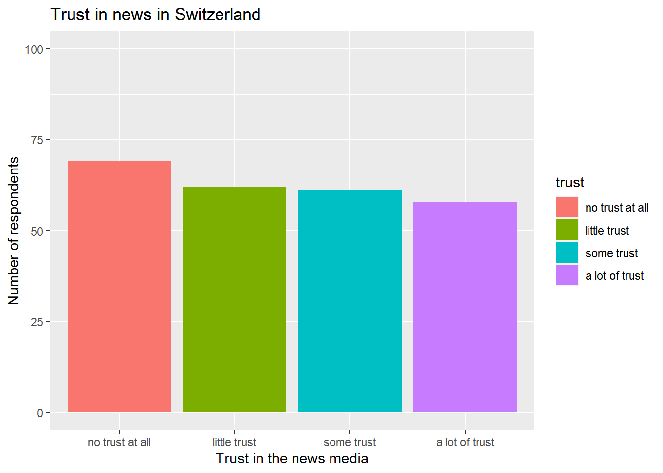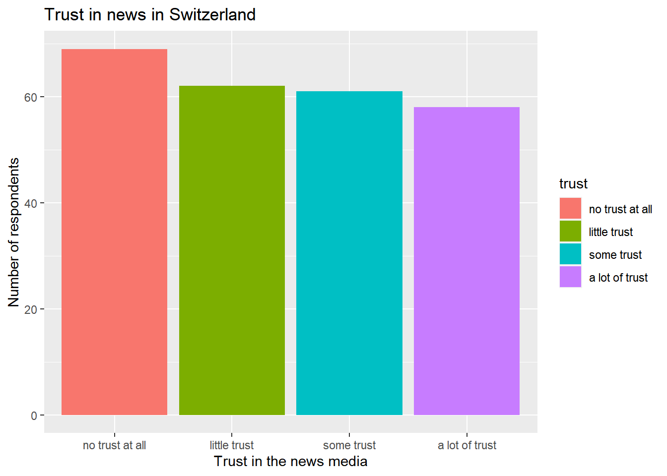 As indicated by the graph above, most people in Switzerland said that they have no trust in the news at all (69 respondents), fewer have little trust (62 respondents), some trust (61 respondents), or a lot of trust (58 respondents):