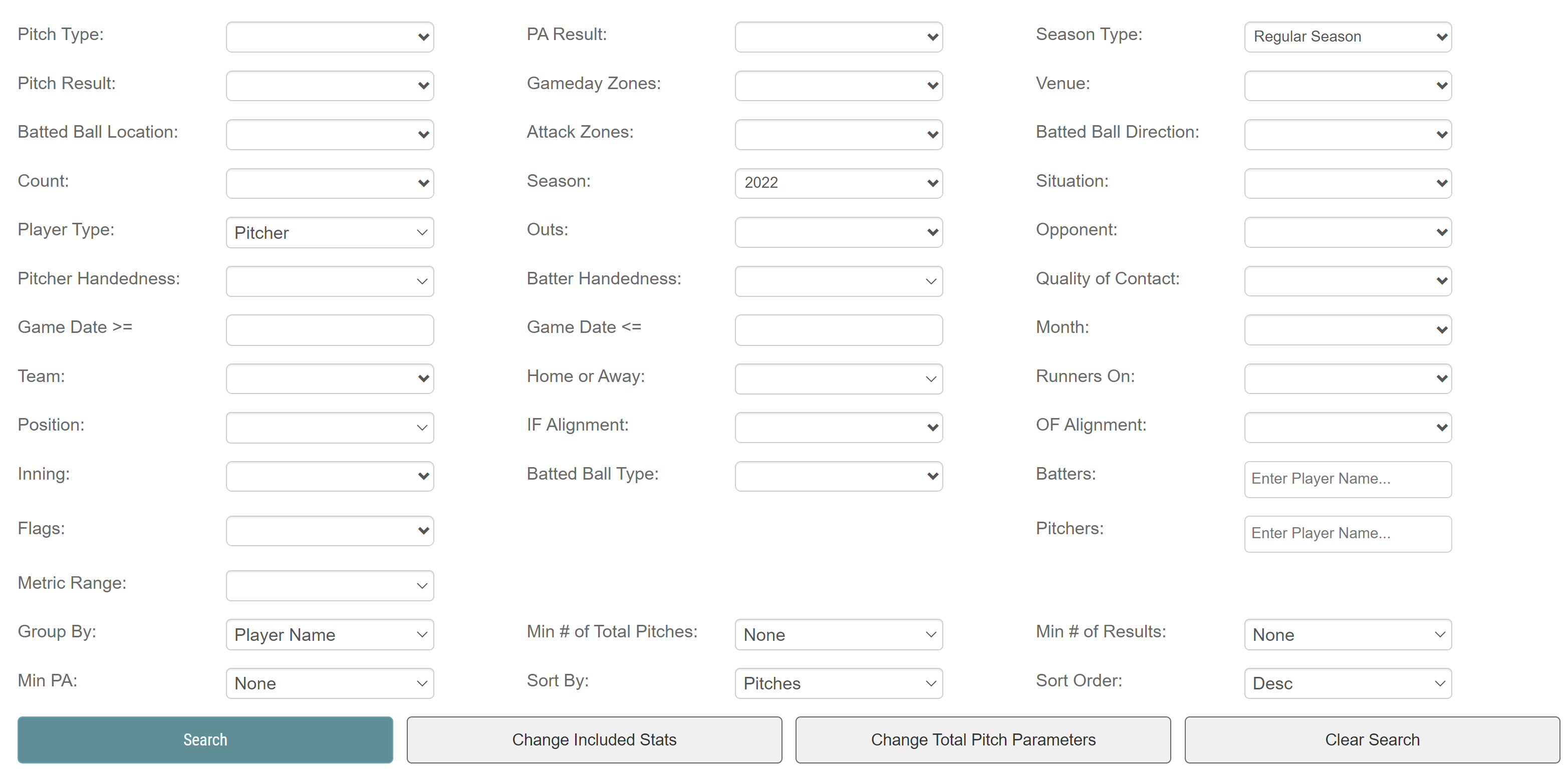 The file we downloaded is the default table from clicking on “Statistics”, “Player Pitching”, “2022”. No variables were added or removed.