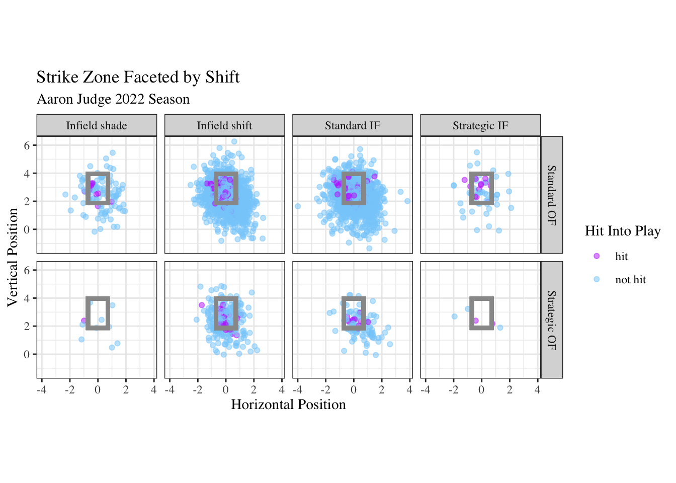 labs(title = "Strike Zone Faceted by Shift", subtitle = "Aaron Judge 2022 Season",