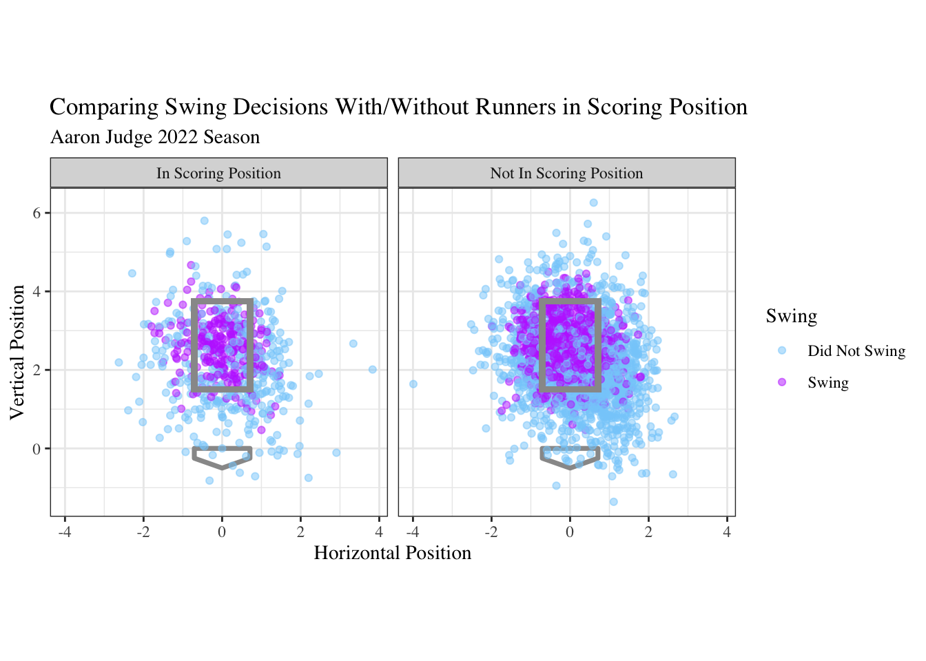 There are some variables not currently present in the data frame that could be interesting to look at. The first is if Aaron Judge swung at the pitch ore not. We know Judge swung at swinging strikes, fouls, or pitches hit into play. Using the mutate() function we can create a variable called ‘swing’ that returns TRUE if the pitch resulted in one of the conditions previous listed, or FALSE if it did not. The second new variable is for scoring position. If there was a runner on second and/or third base, ‘scoring_pos’ will return TRUE.