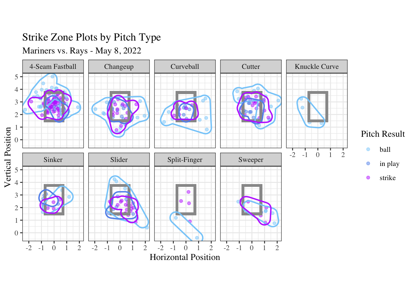 scale_color_manual()function. A list of colors can be found here. coord_fixed()keeps the ratio of the graph fixed regardless of the size of the graph.theme_bw()makes the plot have a white background with light grey grid lines.theme(legend.position = "none")hides the key explaining what each color is representing.theme(text = element_text(family = "serif"))changes the font of the text.facet_wrap()splits the plots by whatever variable is specified. In this case, balls and strikes each have their own separate graph.