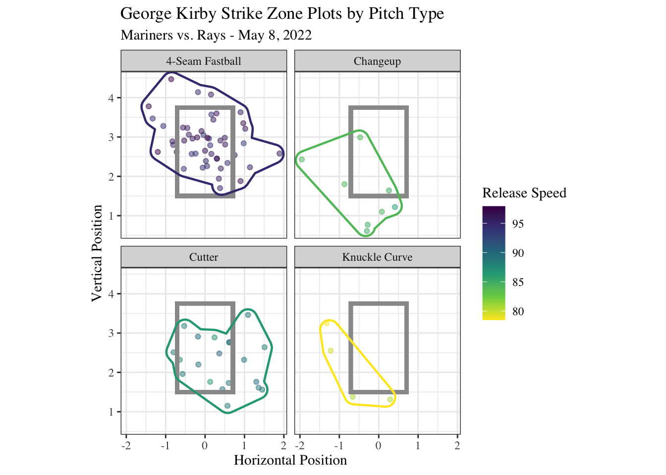 judge <- statcast_search(start_date = "2022-04-05", end_date= "2022-10-23", playerid = 592450)Second, is pitch-by-pitch data from a single game. The game chosen is from May 8, 2022 Seattle Mariners vs. Tampa Bay Rays. This was George Kirby’s MLB debut!