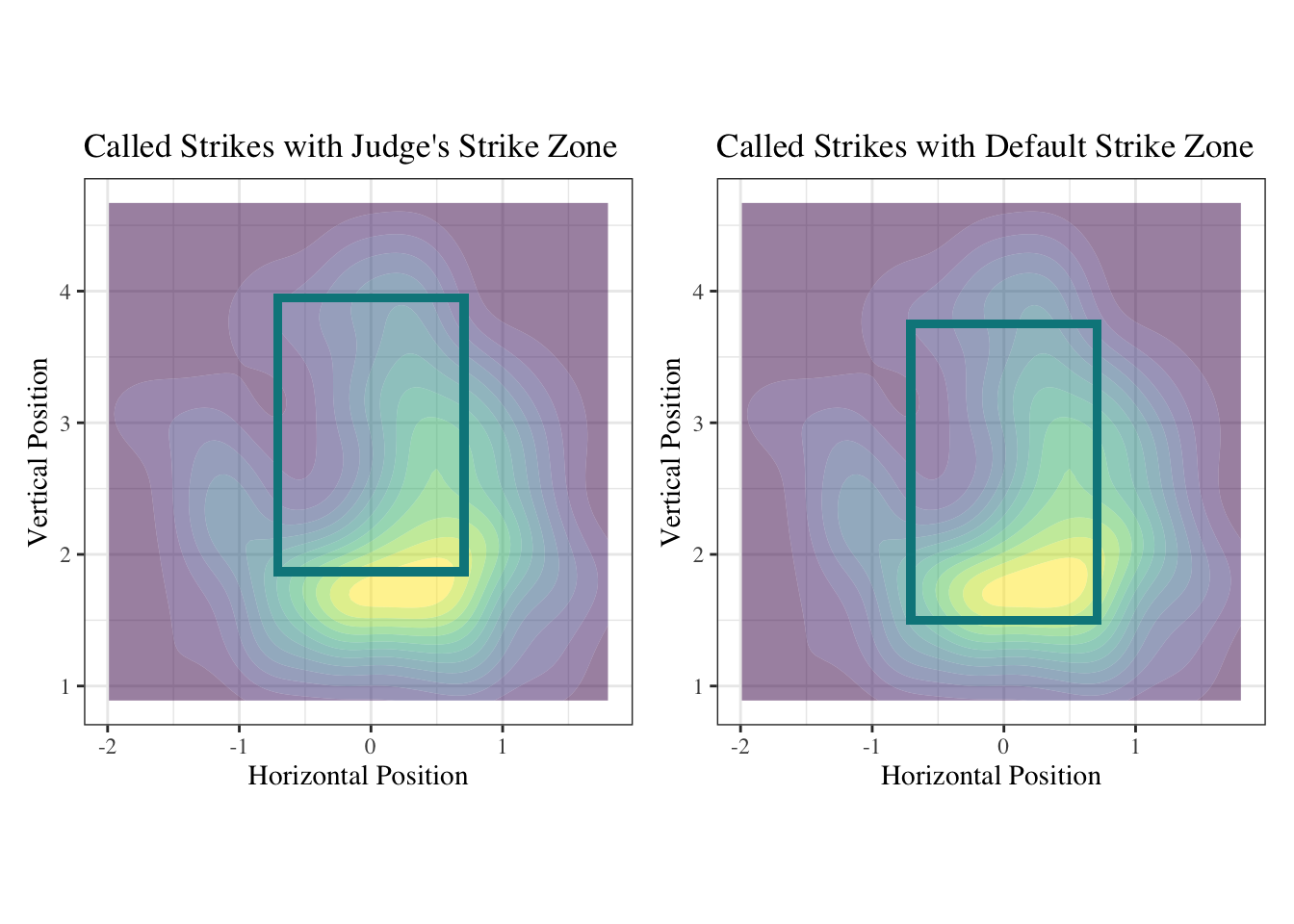 Having the plots next to each other reveals that Judge’s specific strike zone is much higher than the general strike zone.