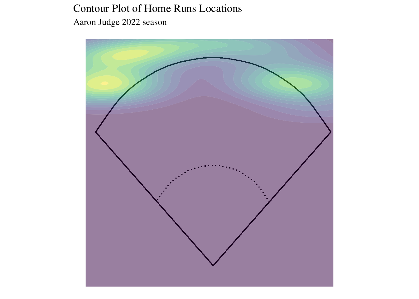 labs(title = "Contour Plot of Home Runs Locations", subtitle = "Aaron Judge 2022 season") +