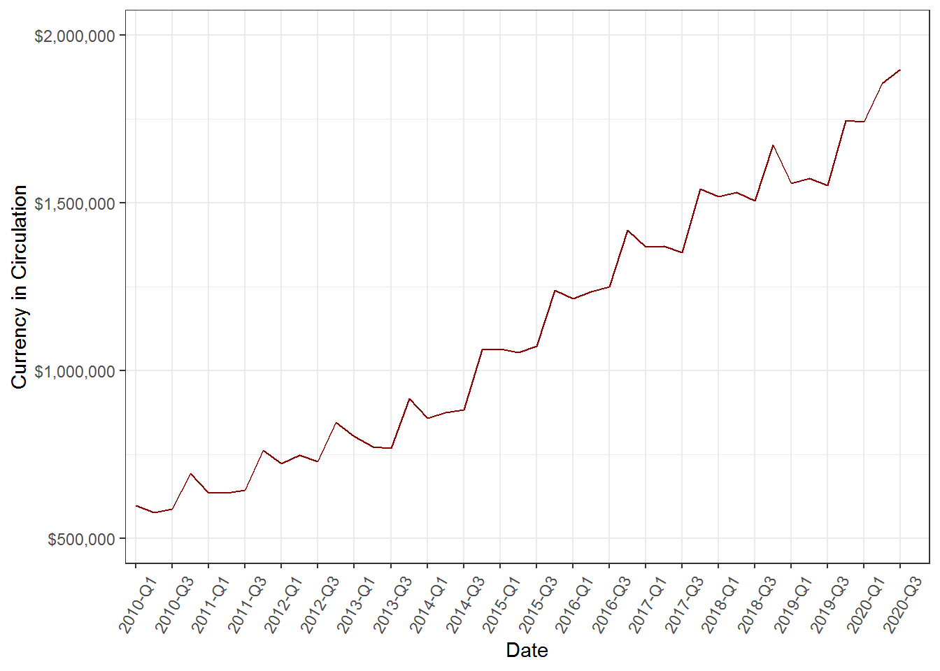 labs(x = "Date", y = "Currency in Circulation")## Warning: Removed 1 row(s) containing missing values (geom_path).
