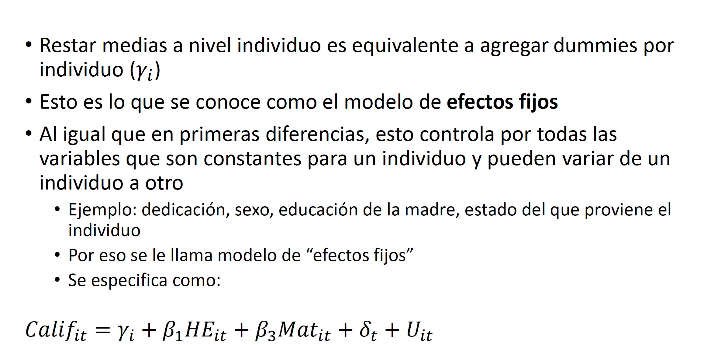 En la nota anterior concluimos que el modelo MCO es extremadamente útil, ya que con muestras grandes y pocos supuestos podemos estimar relaciones funcionales entre dos variables que son sencillas de interpretar. Sin embargo, subrayamos que una limitación importante del modelo cuando queremos establecer relaciones causales es el sesgo por variables omitidas. En esta nota se explicará un modelo que para resolver el problema de sesgo por variables omitidas impone supuestos en dichas variables omitidas y hace uso de una estructura de datos de panel.