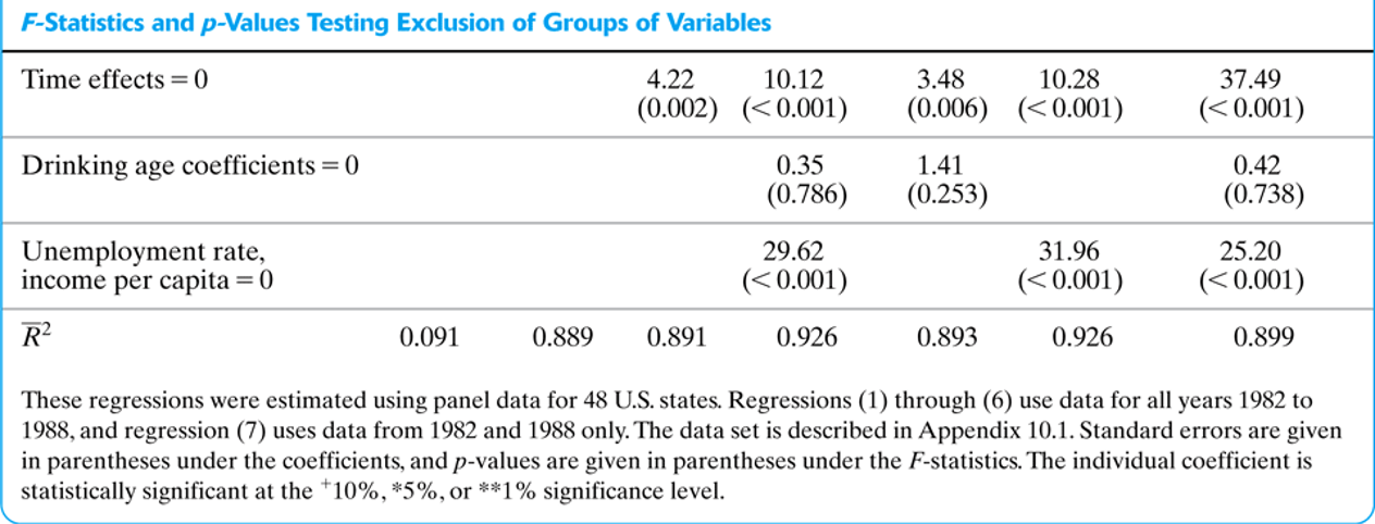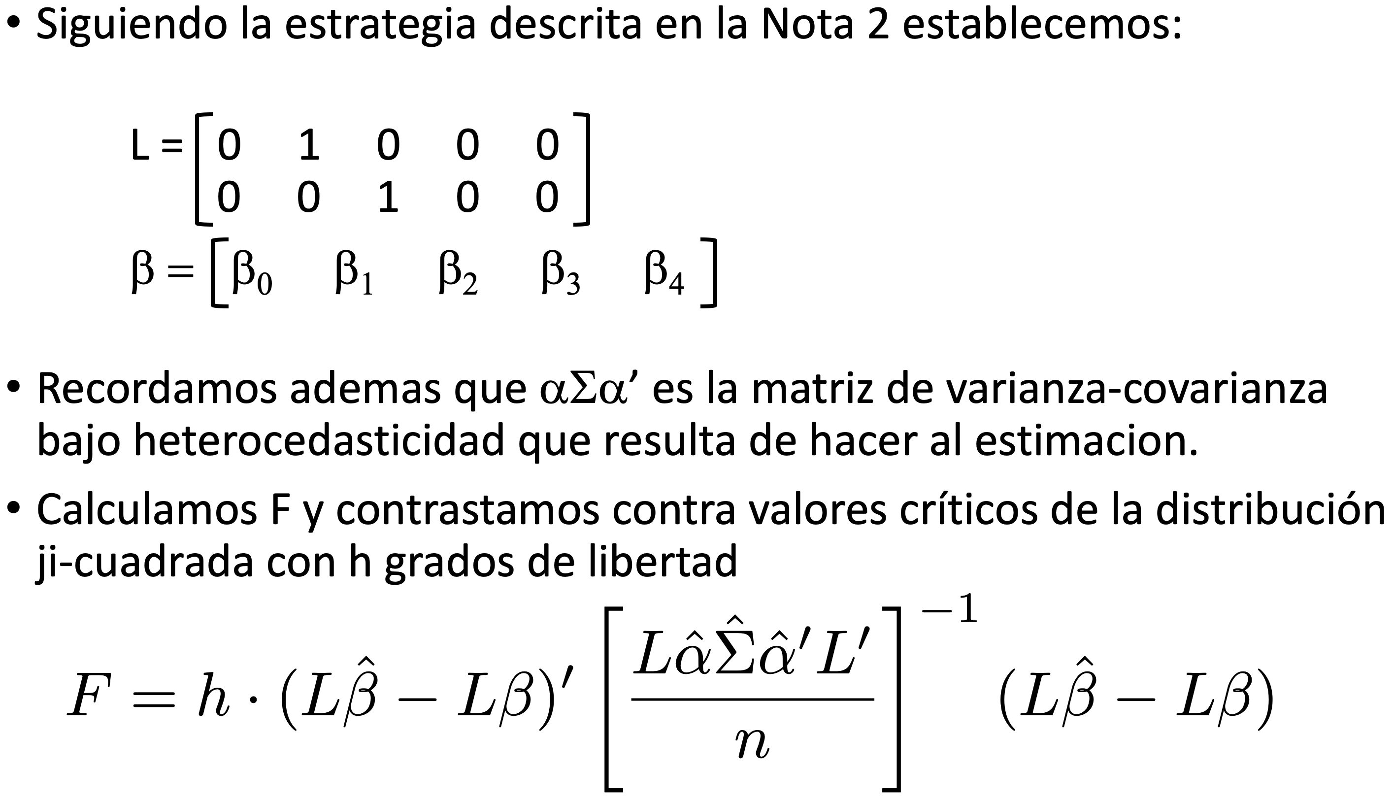 En este caso, si nuevamente tuviesemos una especificación con 4 variables (más la constante), \(L\) sería una matriz de tamaño \(2 \times 5\): \[\begin{equation} L=\begin{bmatrix} 0 & 0 & 1 & 0 & 0 \\ 0 & 0 & 0 & 1 & 0 \end{bmatrix} \end{equation}\]