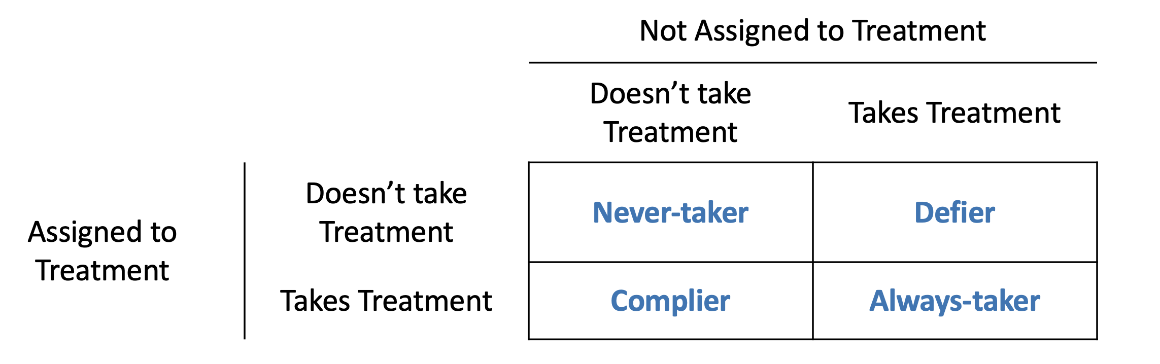 \[Y_1=\gamma_0+\gamma_1Z_i+U_i\] \[T_i=\eta_0+\eta_1Z_i+V_i\] LATE (ATE on compliers) \[\dfrac{\partial Y}{\partial T}=\frac{\dfrac{\partial Y}{\partial Z}}{\dfrac{\partial T}{\partial Z}}=\frac{\gamma_1}{\eta_1}\] ## RCT in practice