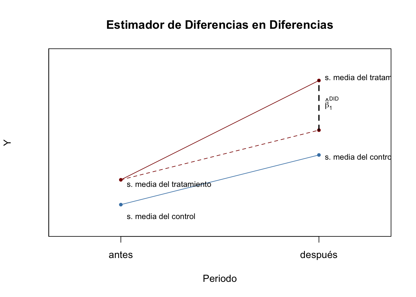 \[ \begin{align} \widehat{\beta}_1^{\text{diffs-in-diffs}} =& \, (\overline{Y}^{\text{tratamiento,después}} - \overline{Y}^{\text{tratamiento,antes}}) - (\overline{Y}^{\text{control,después}} - \overline{Y}^{\text{control,antes}}) \\ =& \Delta \overline{Y}^{\text{tratamiento}} - \Delta \overline{Y}^{\text{control}} \end{align} \] con