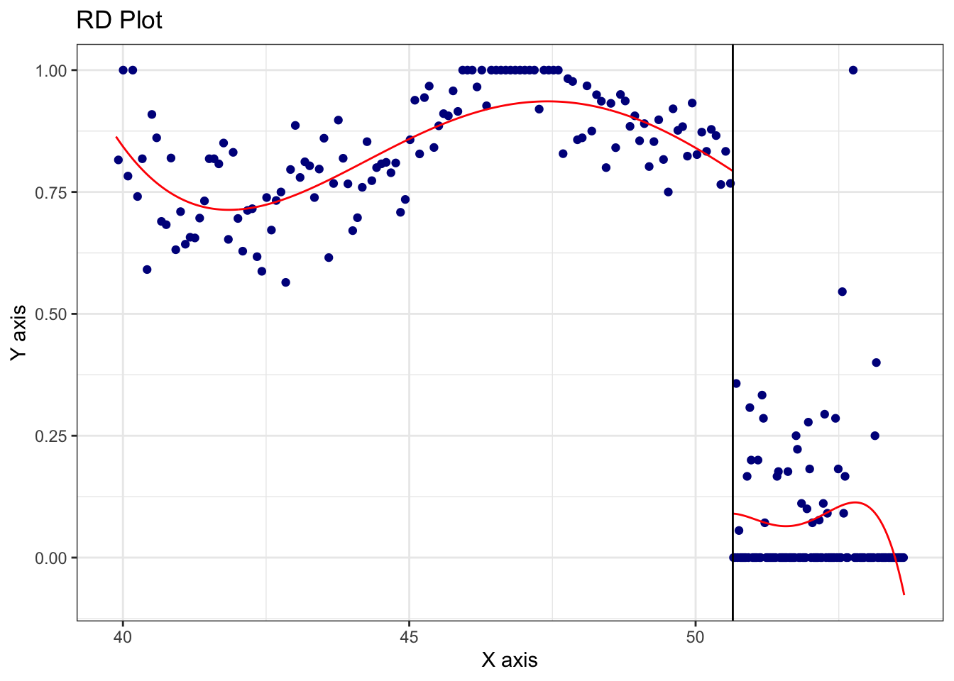rdplot(datos$D,datos$puntaje,c= 50.65)## [1] "Mass points detected in the running variable."