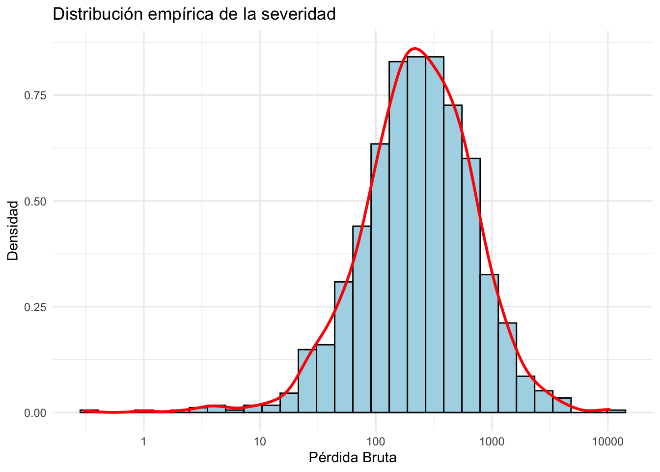 labs(title = "Distribución empírica de la severidad", x = "Pérdida Bruta", y = "Densidad") +