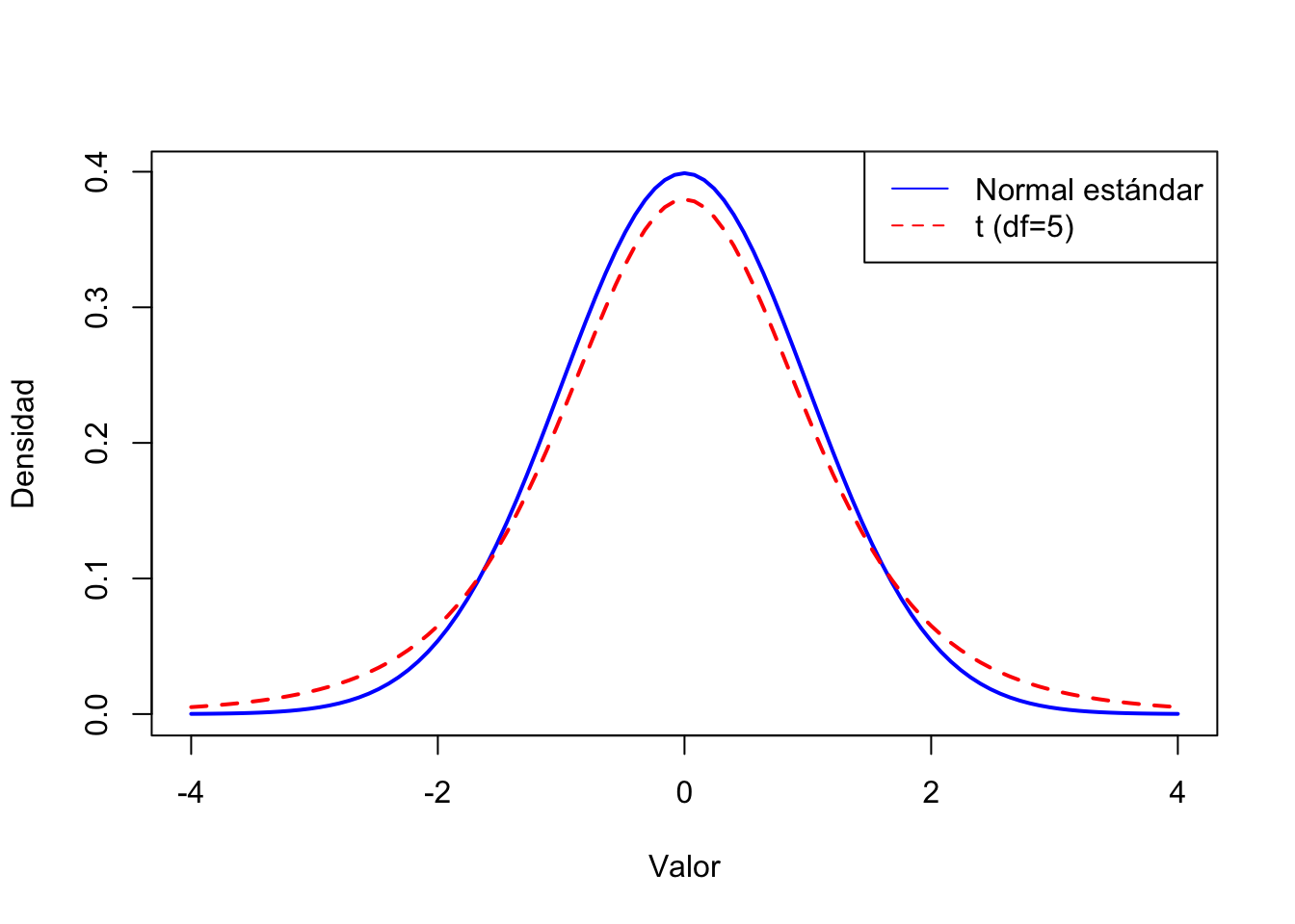 Comparar visualmente la distribución normal estándar con una t de Student con 5 grados de libertad: