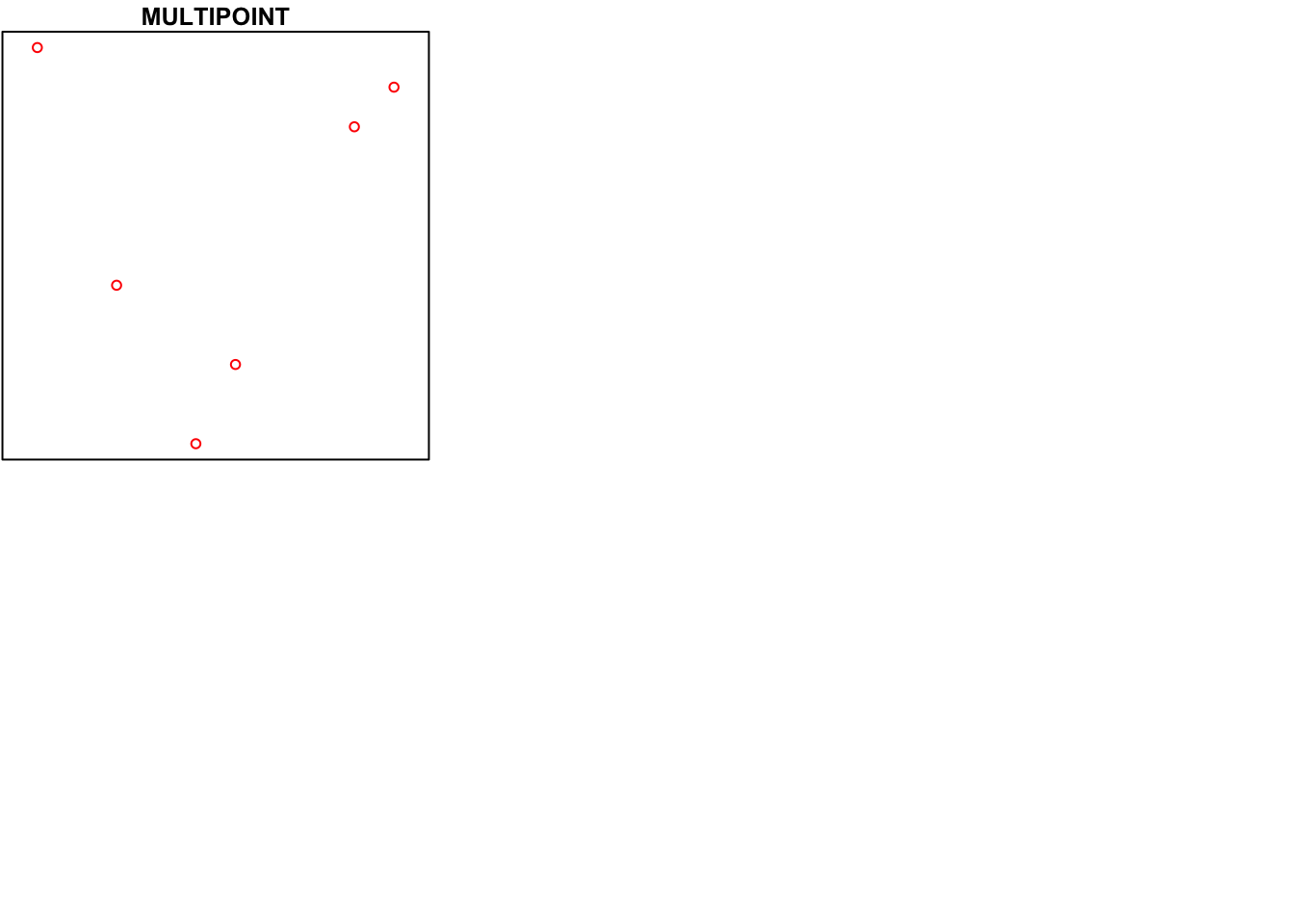 Cada uno de los tipos de geometría también puede ser un conjunto vacío, que contiene coordenadas cero (para PUNTO, el estándar no está claro cómo representar la geometría vacía). Se puede considerar que las geometrías vacías son análogas a los atributos faltantes (NA), los valores NULL o las listas vacías.
