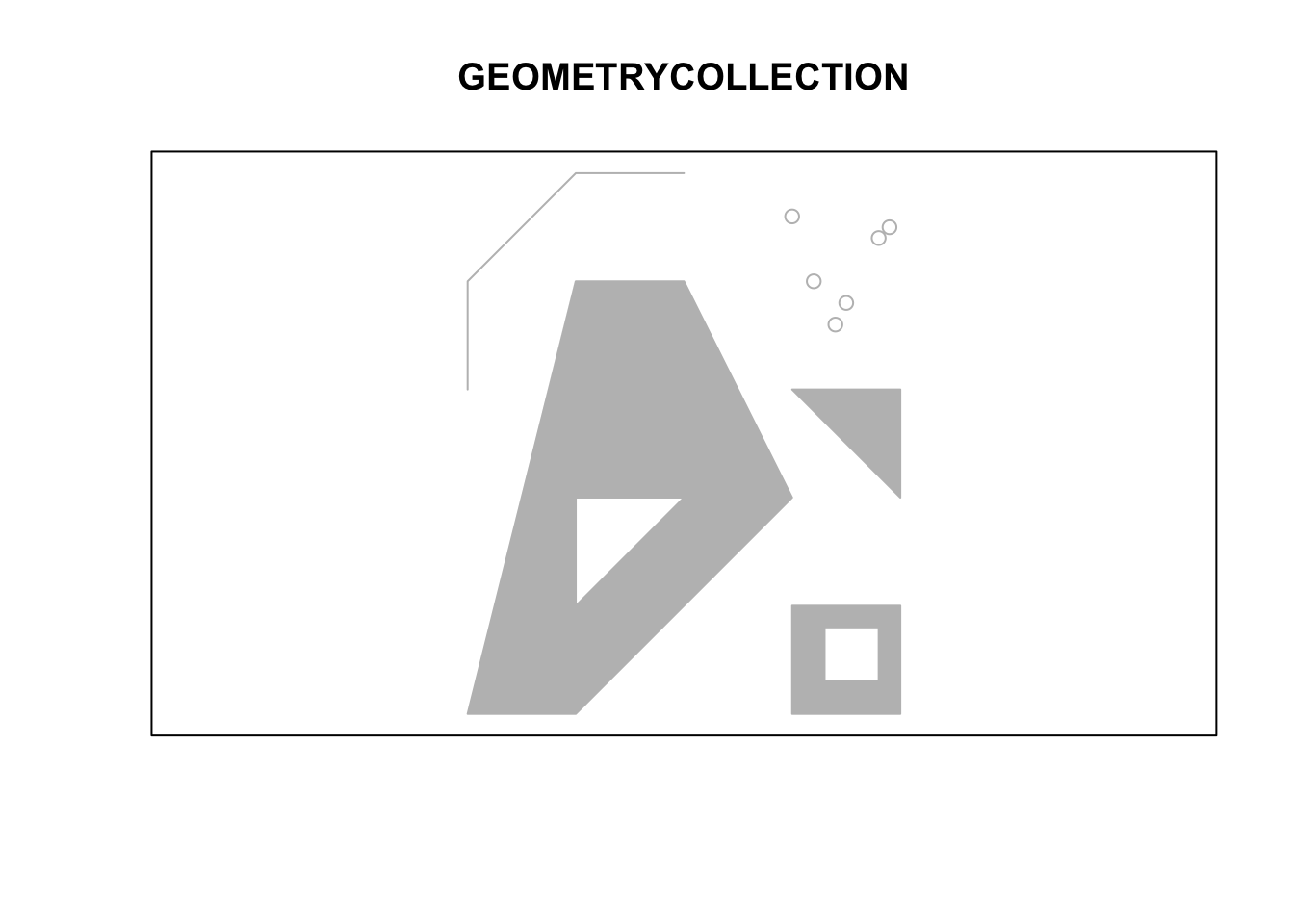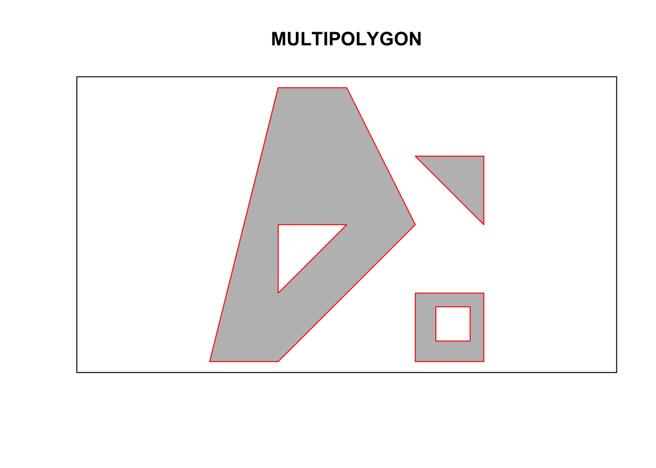 (mpol <- st_multipolygon(list(list(p1,p2), list(p3,p4), list(p5))))## MULTIPOLYGON (((0 0, 1 0, 3 2, 2 4, 1 4, 0 0), (1 1, 1 2, 2 2, 1 1)), ((3 0, 4 0, 4 1, 3 1, 3 0), (3.3 0.3, 3.3 0.8, 3.8 0.8, 3.8 0.3, 3.3 0.3)), ((3 3, 4 2, 4 3, 3 3)))