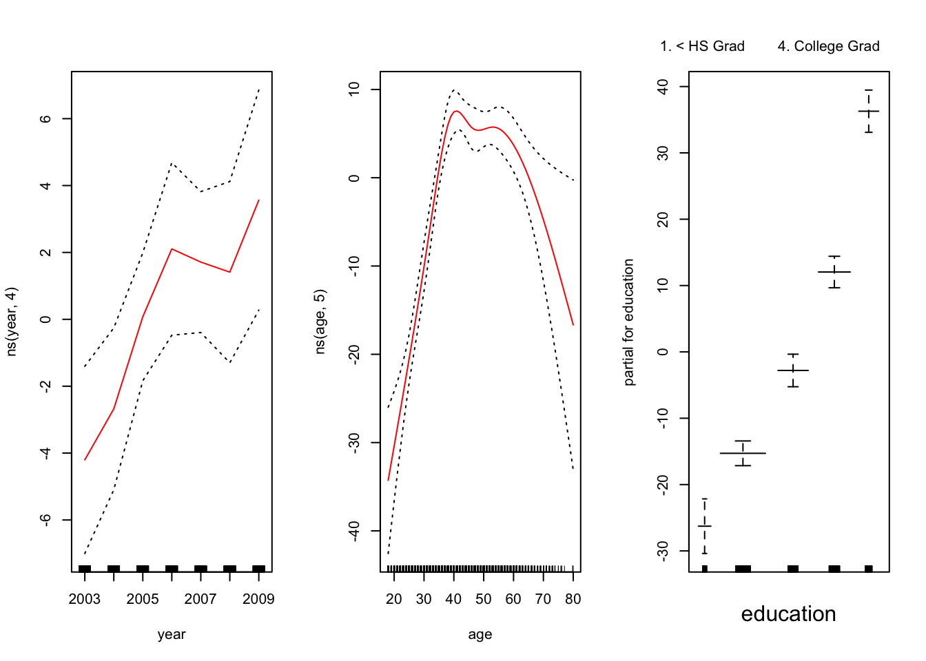 ## lm(formula = wage ~ ns(year, 4) + ns(age, 5) + education, data = Wage)