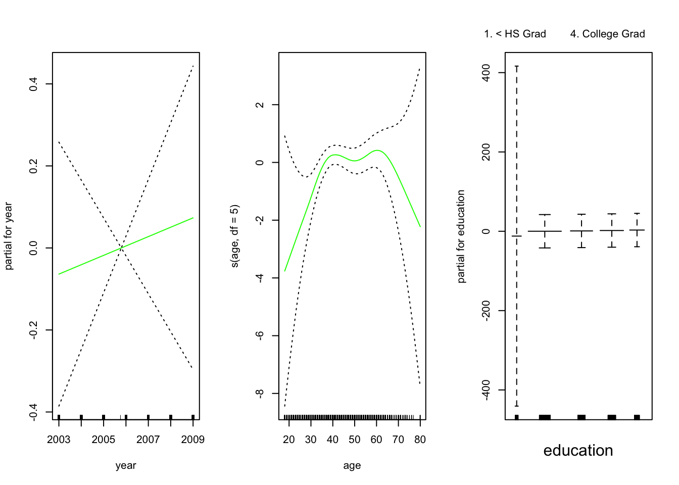 gam.lr.s <- gam(I(wage > 250) ~ year + s(age, df = 5) + education,