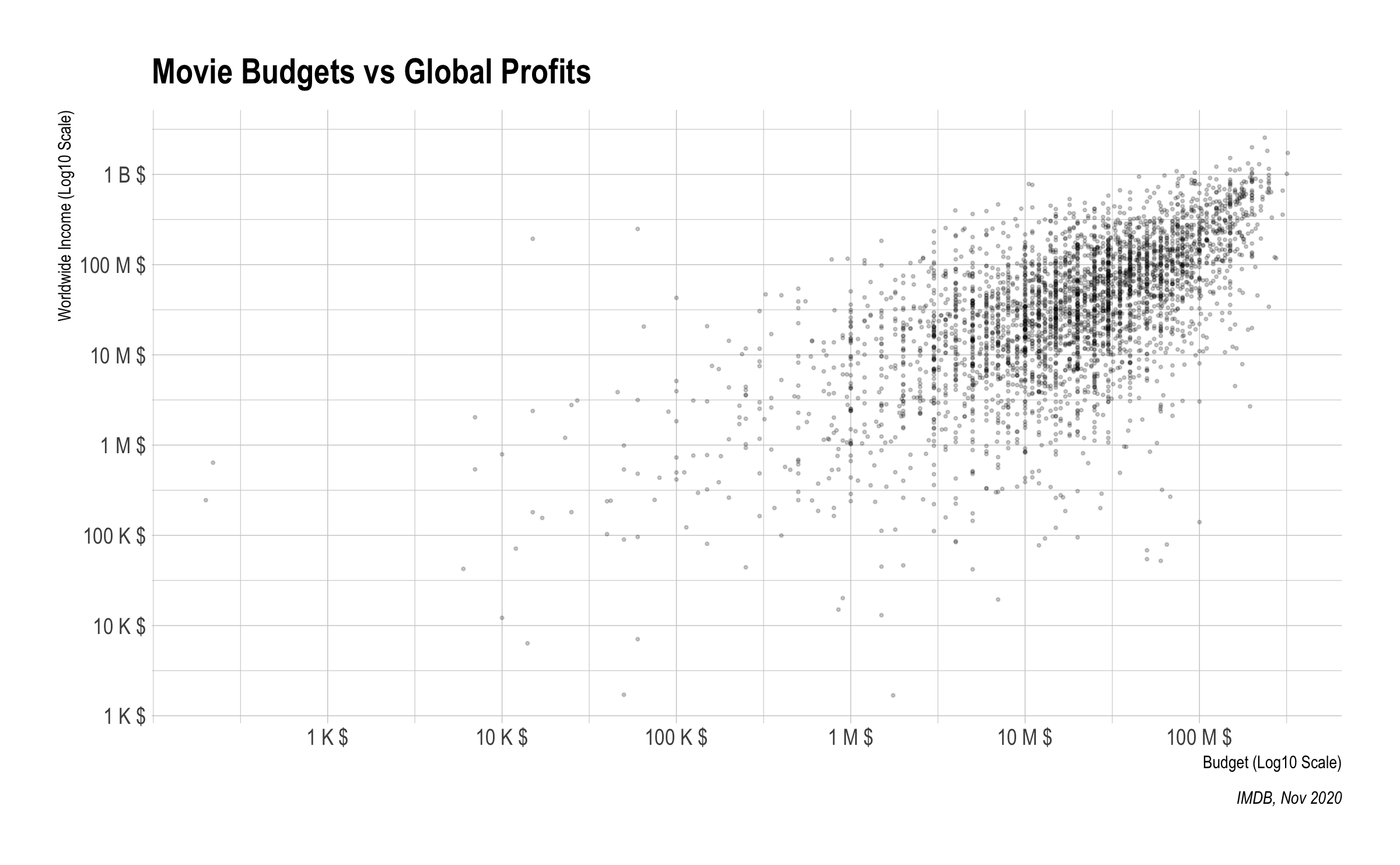 There appears to be a logarithm-scale correlation between film budgets and worldwide revenue.