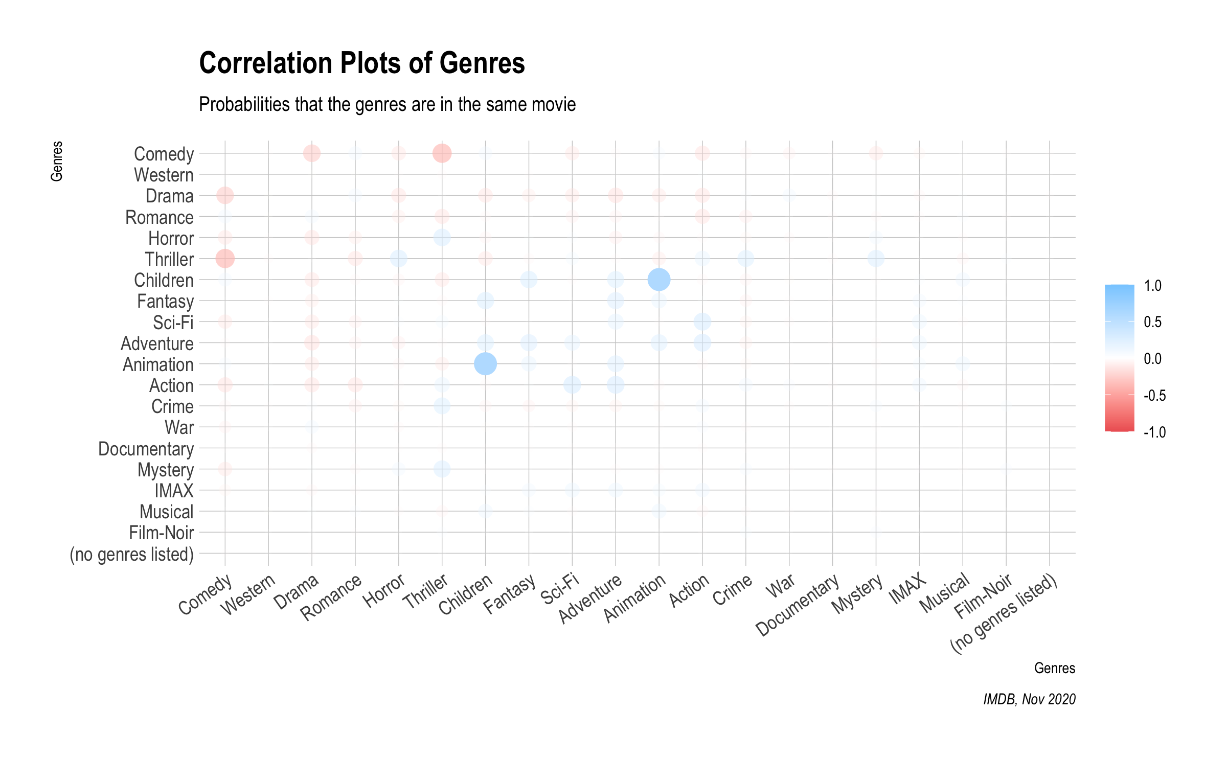 Many films can be defined by more than one genre. In the correlation chart below, the frequency of using the genres together is shown. As expected, the Children and Animation genres are often used together, while Thriller and Comedy are rarely used together.