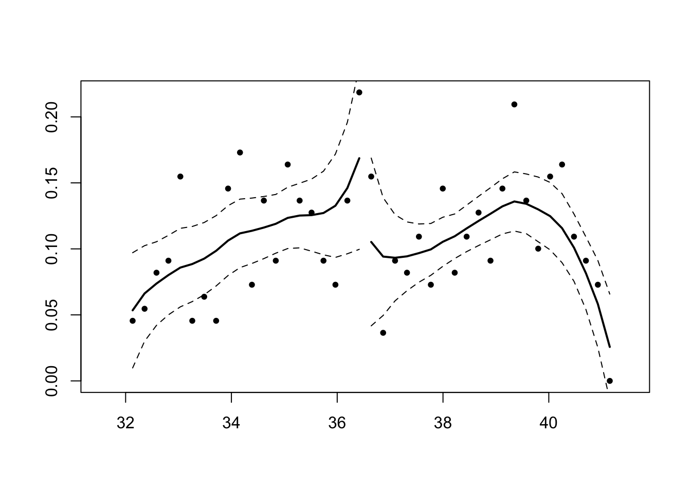 ## z = -1.6544, binwidth = 0.2255, bandwidth = 1.6019, cutpoint = 36.5300, p-value =