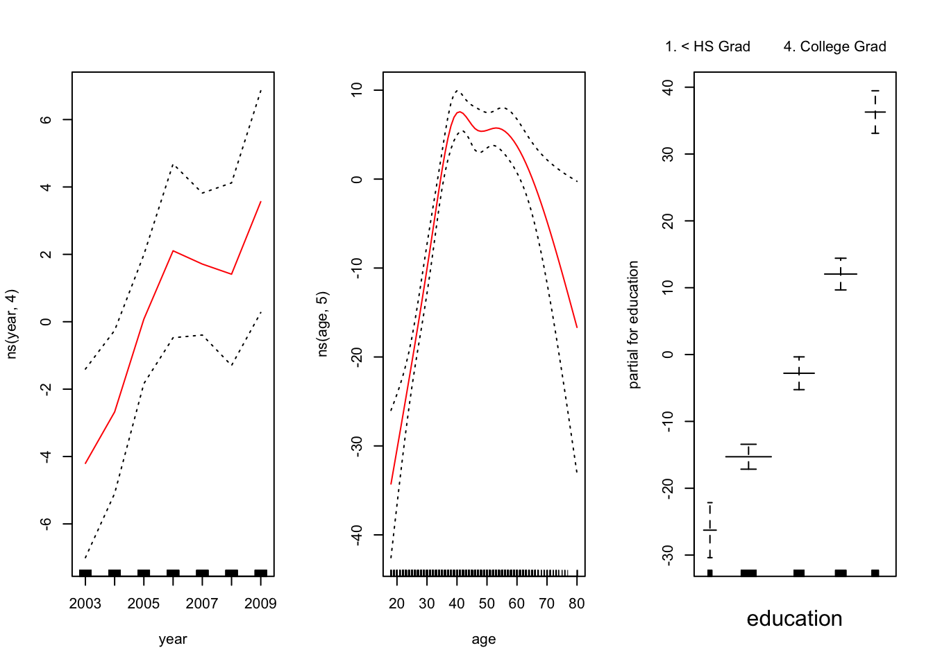 ## lm(formula = wage ~ ns(year, 4) + ns(age, 5) + education, data = Wage)