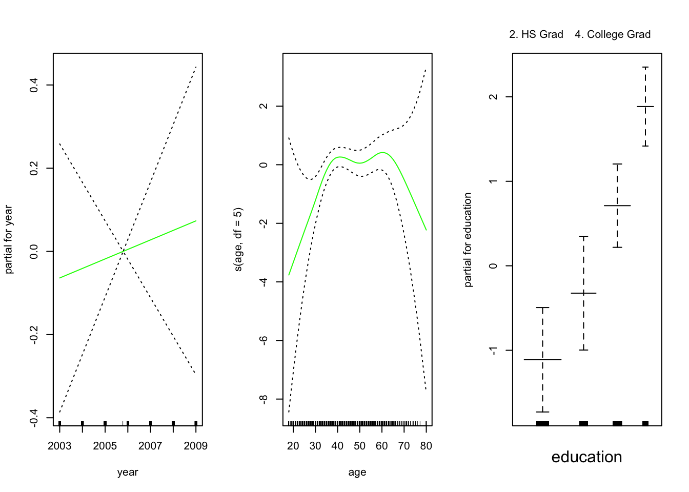 gam.lr.s <- gam(I(wage > 250) ~ year + s(age, df = 5) + education,