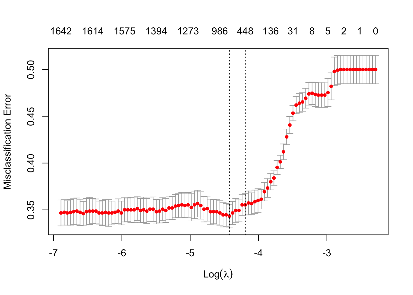 La validación cruzada tiene 10 grupos. El último parámetro type.measure = "class" selecciona el mejor valor lambda de penalización entre los modelos de validación cruzada en función de la tasa de clasificación errónea más baja entre clickbait y titulares legítimos.