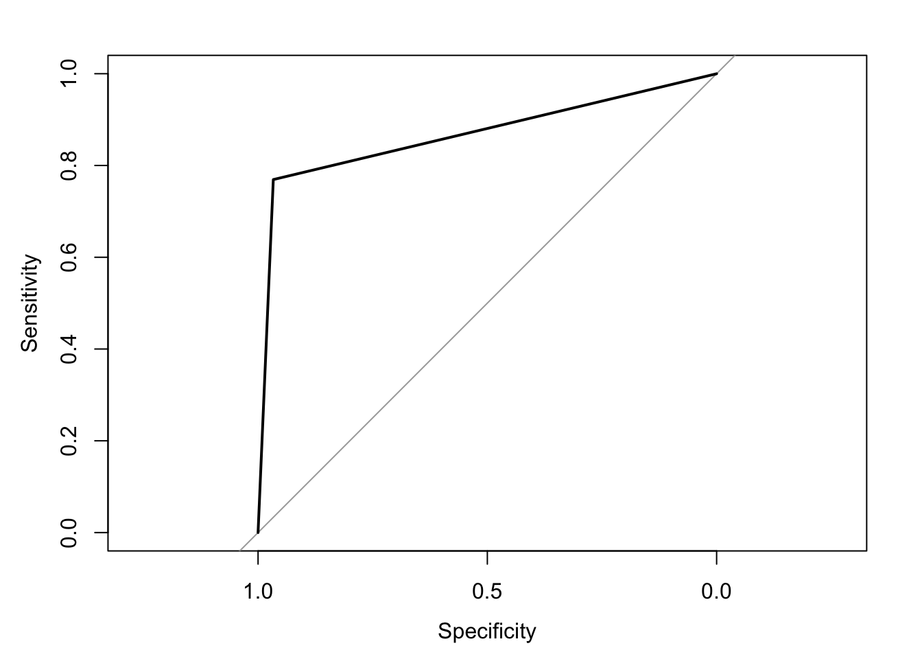 Ahora calculamos la curva ROC: La curva representa la relación entre la sensibilidad y la especificidad del modelo. En otras palabras, se muestra la relación entre la tasa de verdaderos positivos en el eje \(y\) y la tasa de falsos positivos en el eje \(x\).